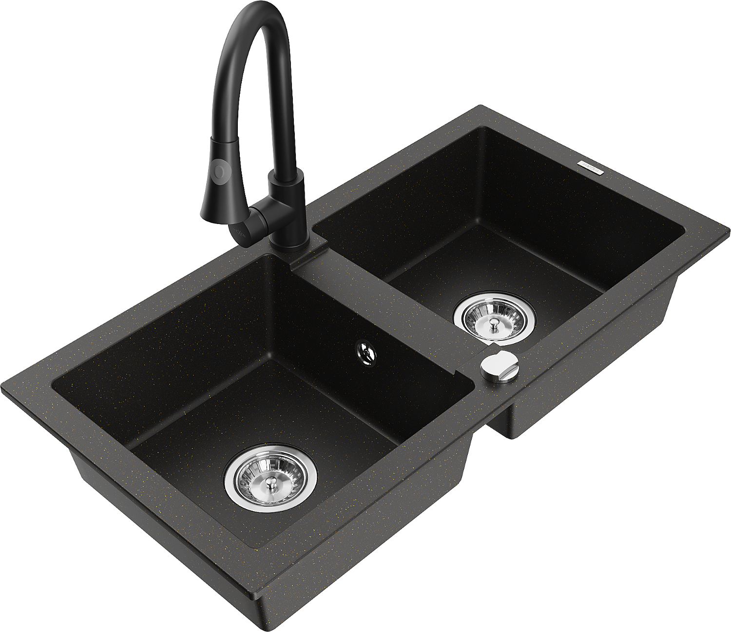 Mexen Mario zlewozmywak granitowy 2-komorowy z baterią kuchenną Elia, czarny/złoty metalik - 6504-75-670101-70
