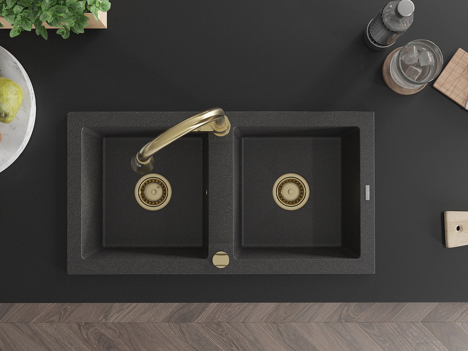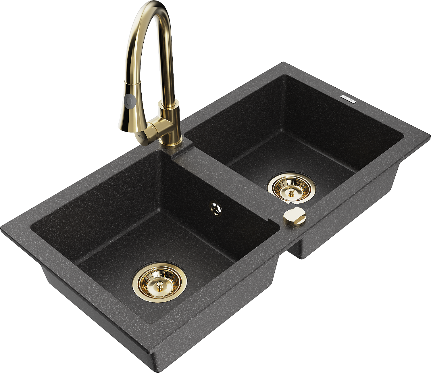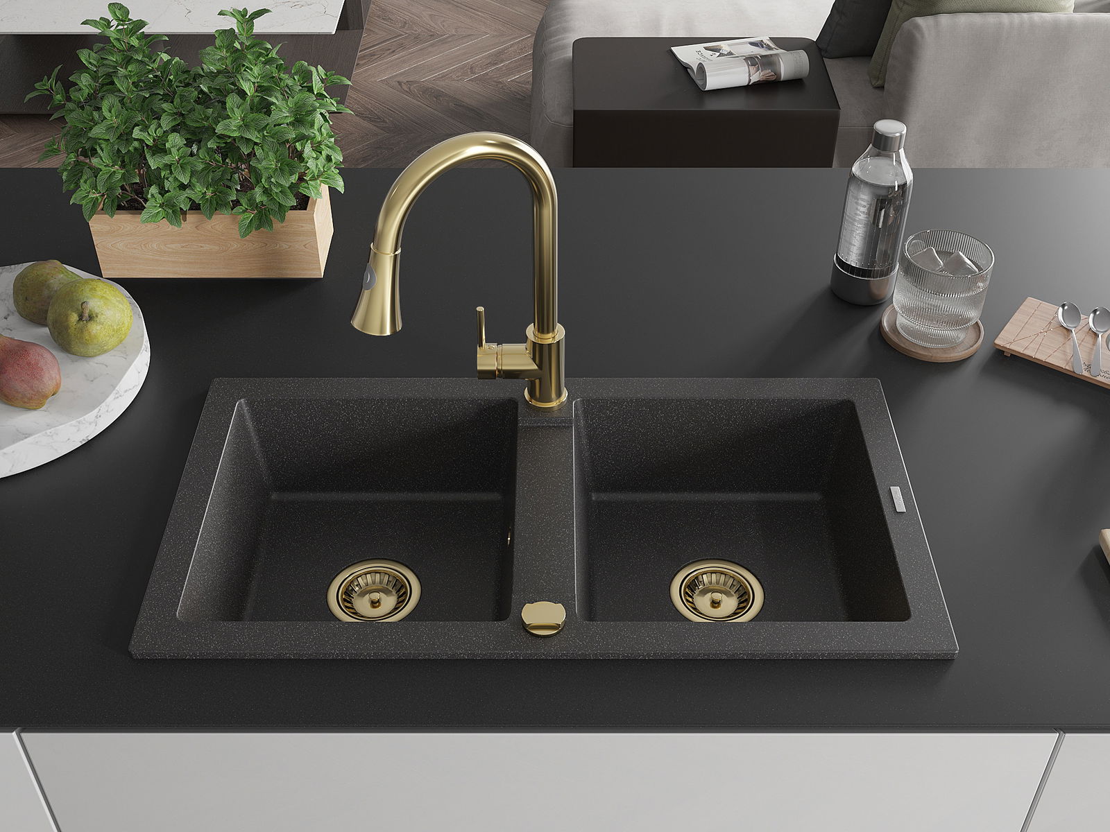 Mexen Mario zlewozmywak granitowy 2-komorowy z baterią kuchenną Elia, czarny nakrapiany - 6504-76-670101-50