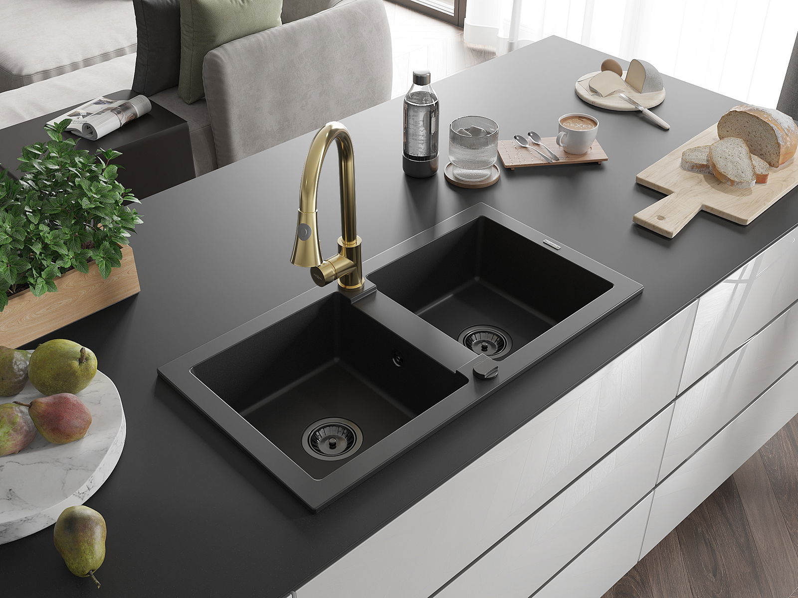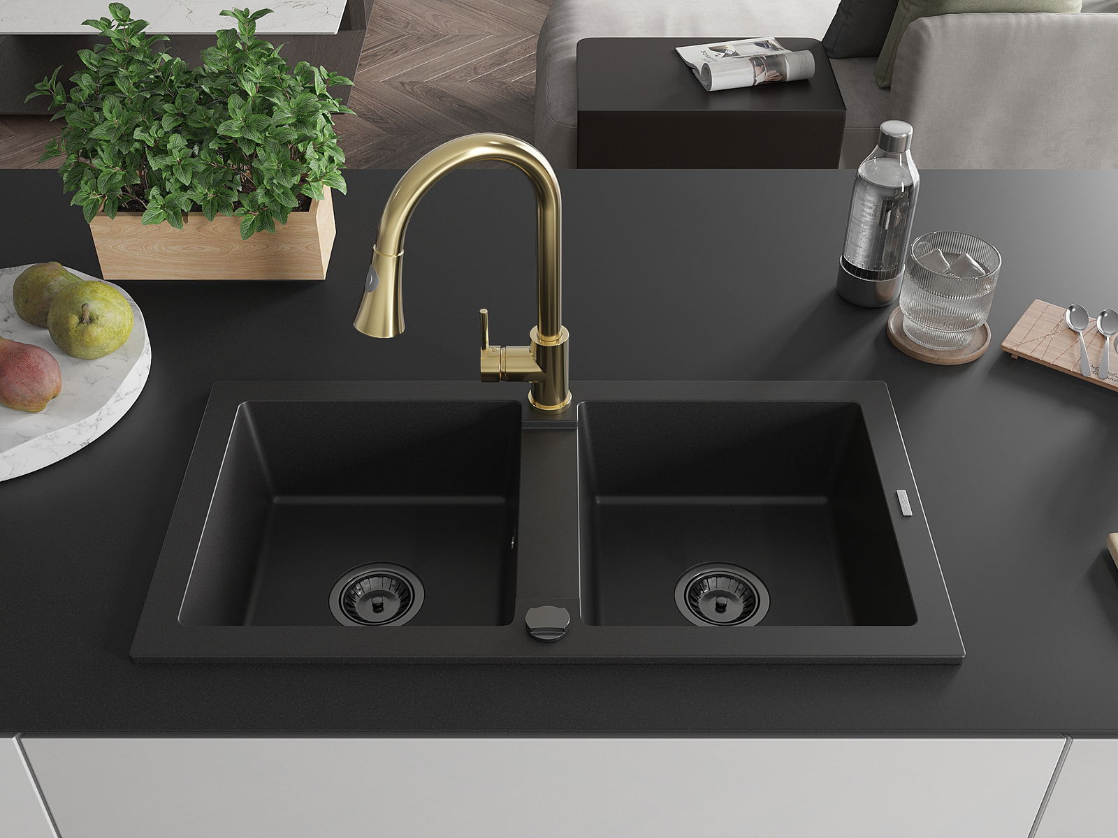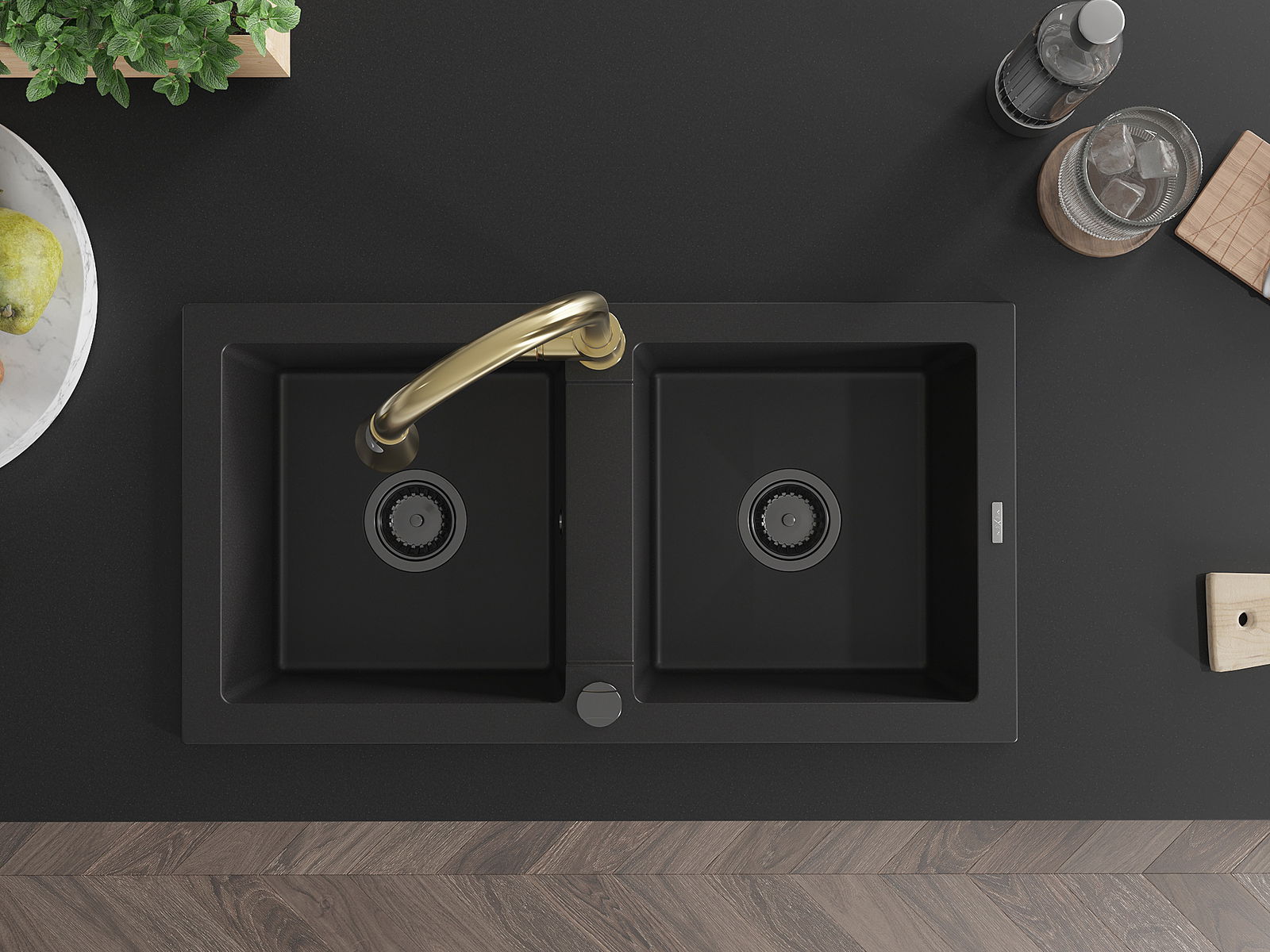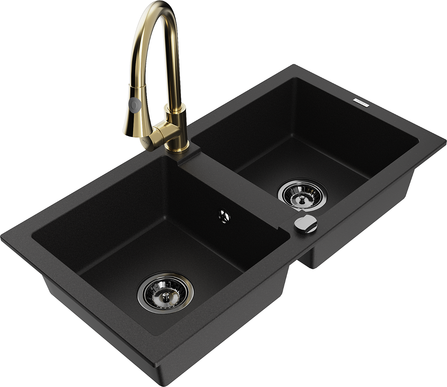 Mexen Mario zlewozmywak granitowy 2-komorowy z baterią kuchenną Elia, czarny - 6504-77-670101-50-B