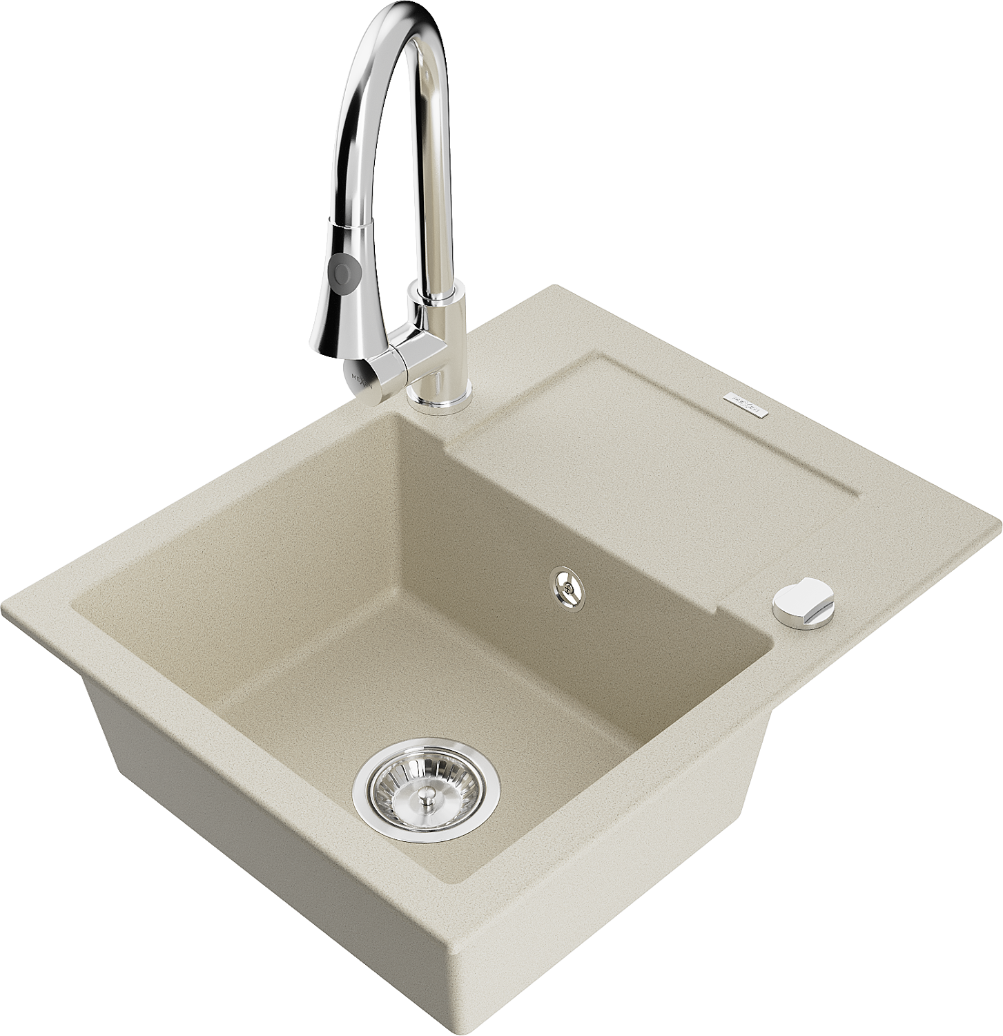 Mexen Enzo zlewozmywak granitowy 1-komorowy z ociekaczem i baterią kuchenną Elia, beżowy - 6506-69-670101-00