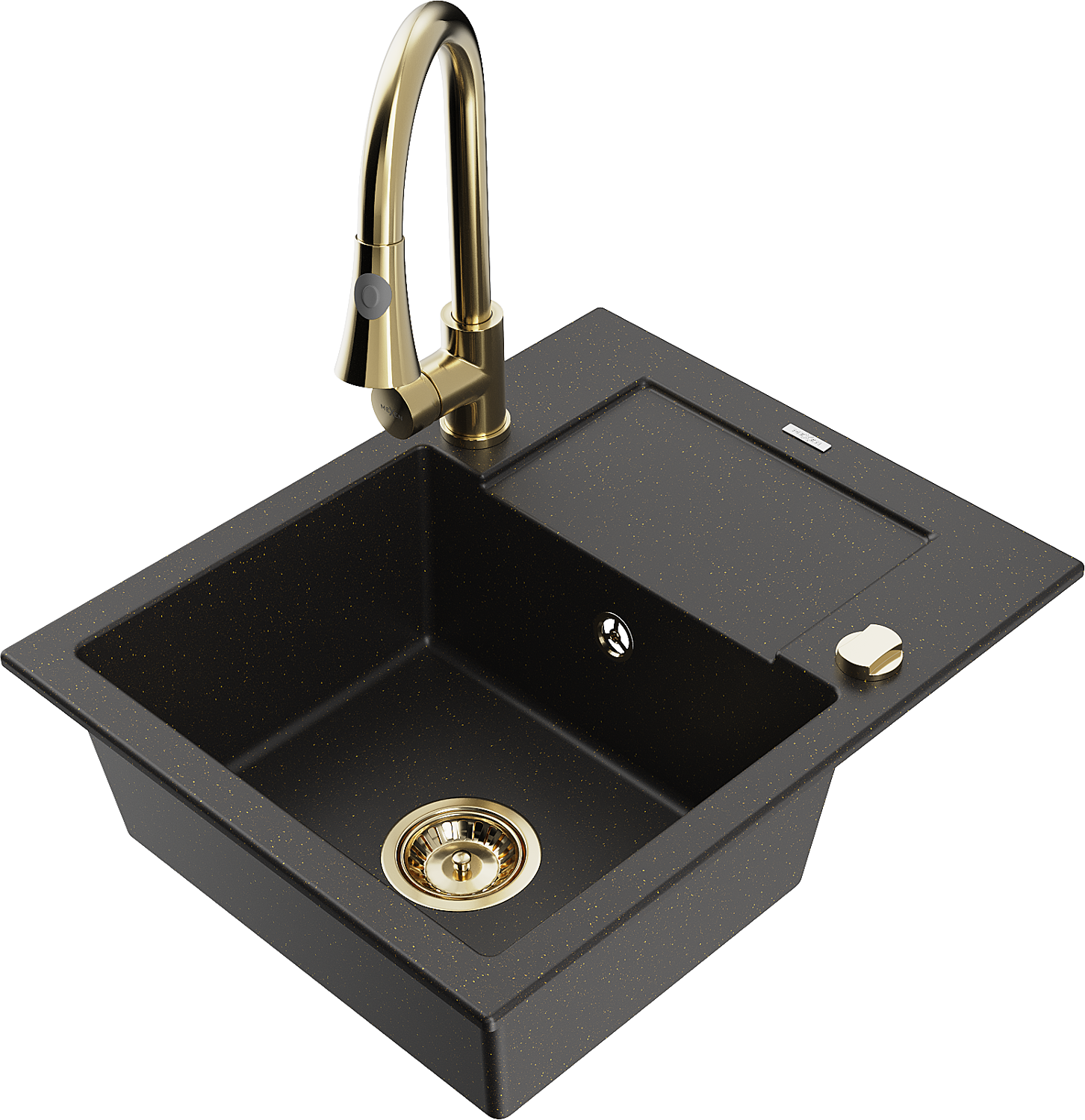 Mexen Enzo zlewozmywak granitowy 1-komorowy z ociekaczem i baterią kuchenną Elia, czarny/złoty metalik - 6506-75-670101-50