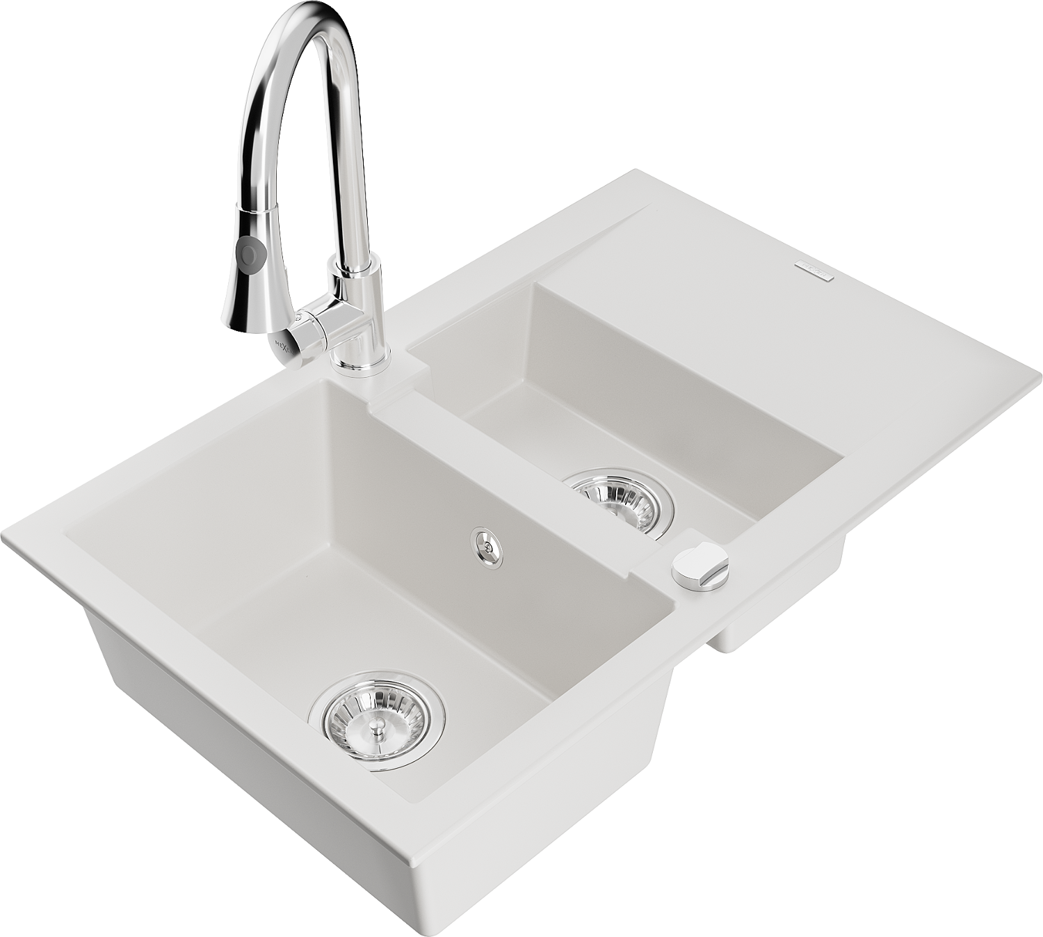 Mexen Gaspar zlewozmywak granitowy 1,5-komorowy z ociekaczem i baterią kuchenną Elia, biały - 6507-20-670101-00