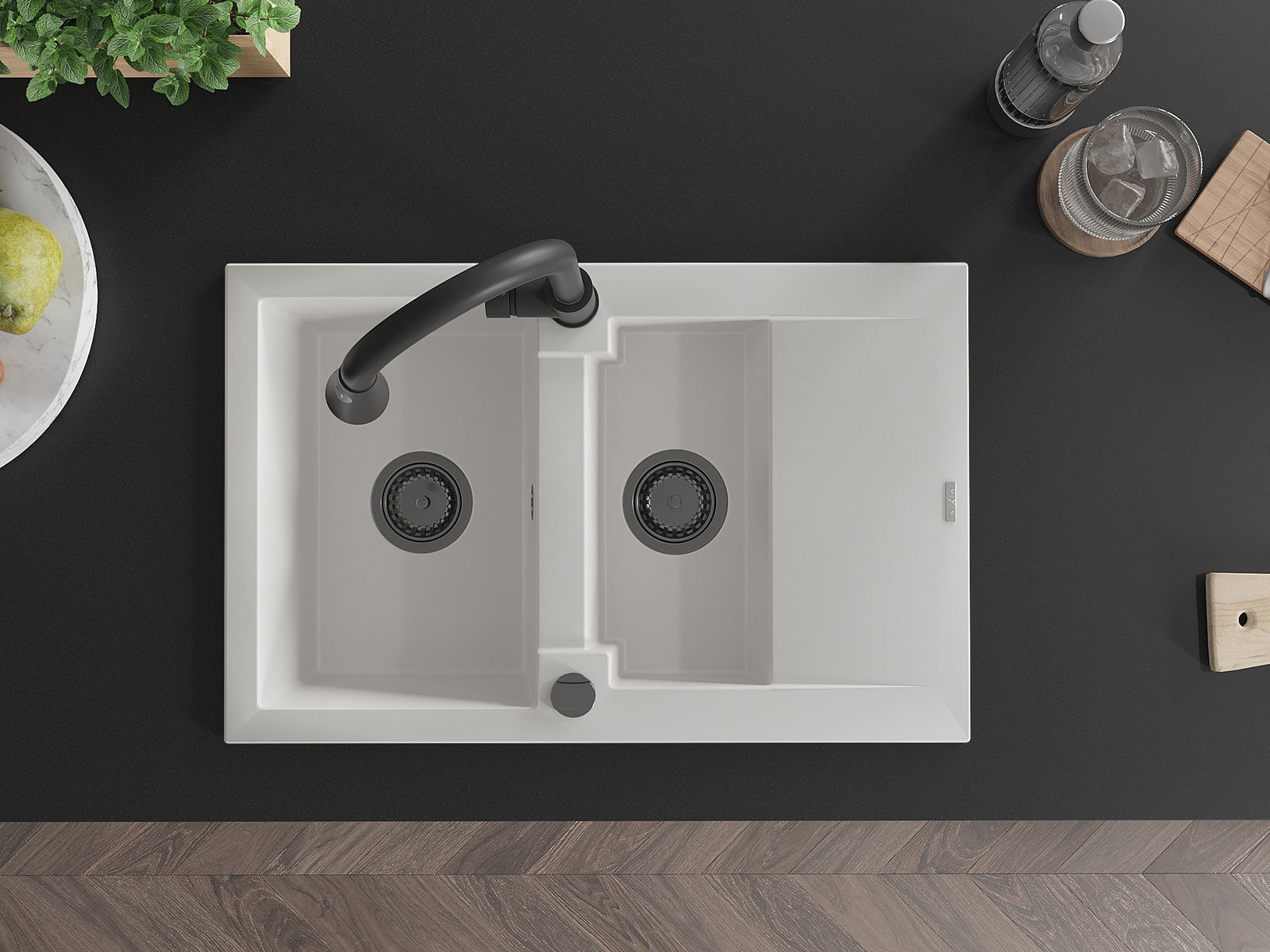 Mexen Gaspar zlewozmywak granitowy 1,5-komorowy z ociekaczem i baterią kuchenną Elia, biały - 6507-20-670101-70