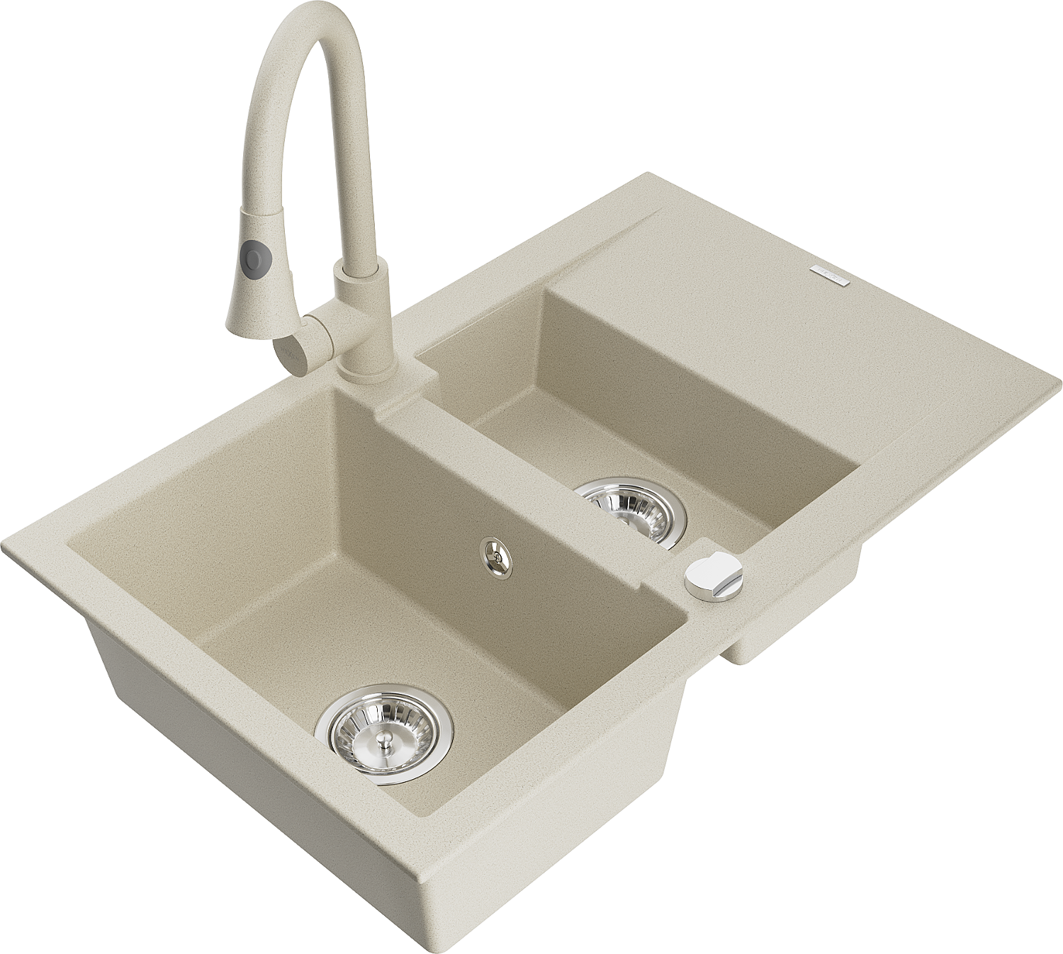 Mexen Gaspar zlewozmywak granitowy 1,5-komorowy z ociekaczem i baterią kuchenną Elia, beżowy - 6507-69-670101-69