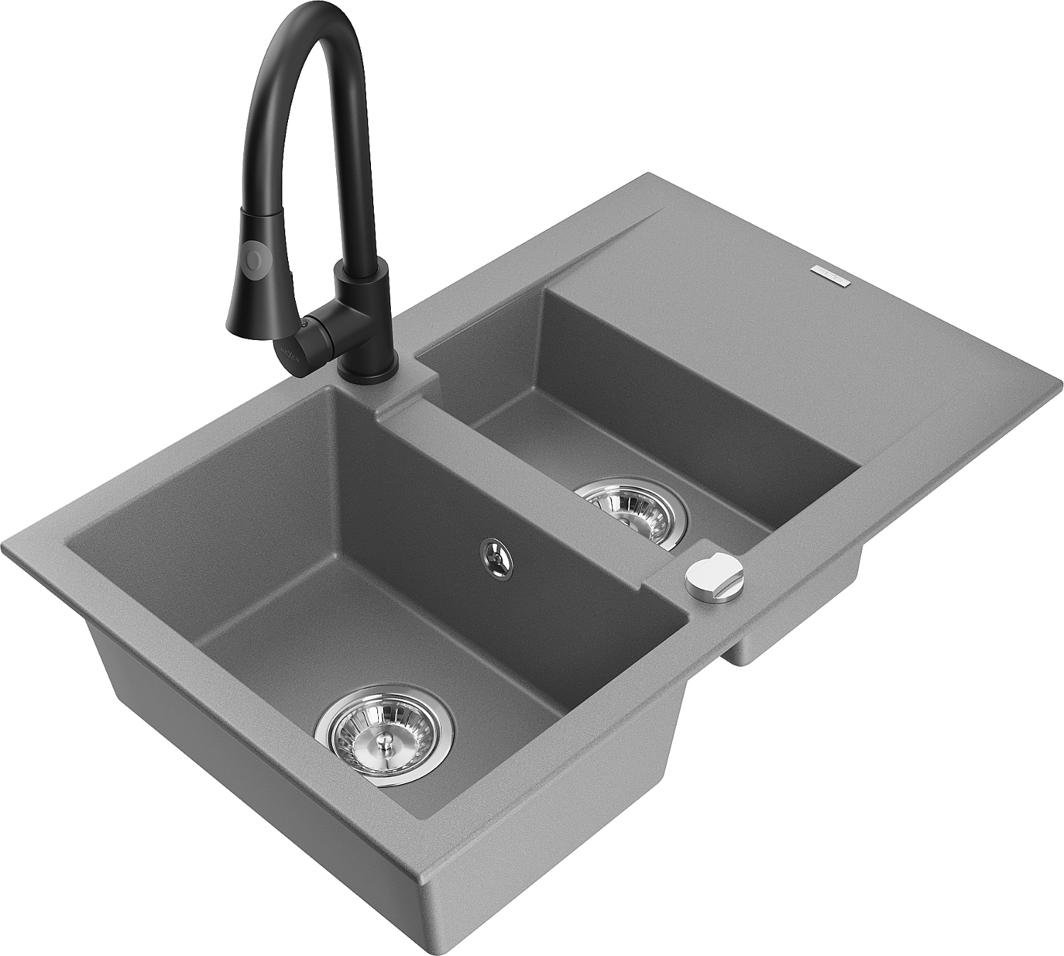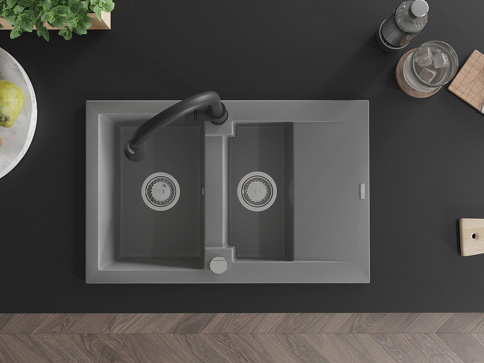 Mexen Gaspar zlewozmywak granitowy 1,5-komorowy z ociekaczem i baterią kuchenną Elia, szary - 6507-71-670101-70