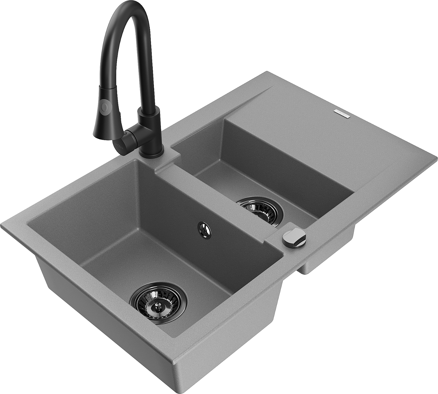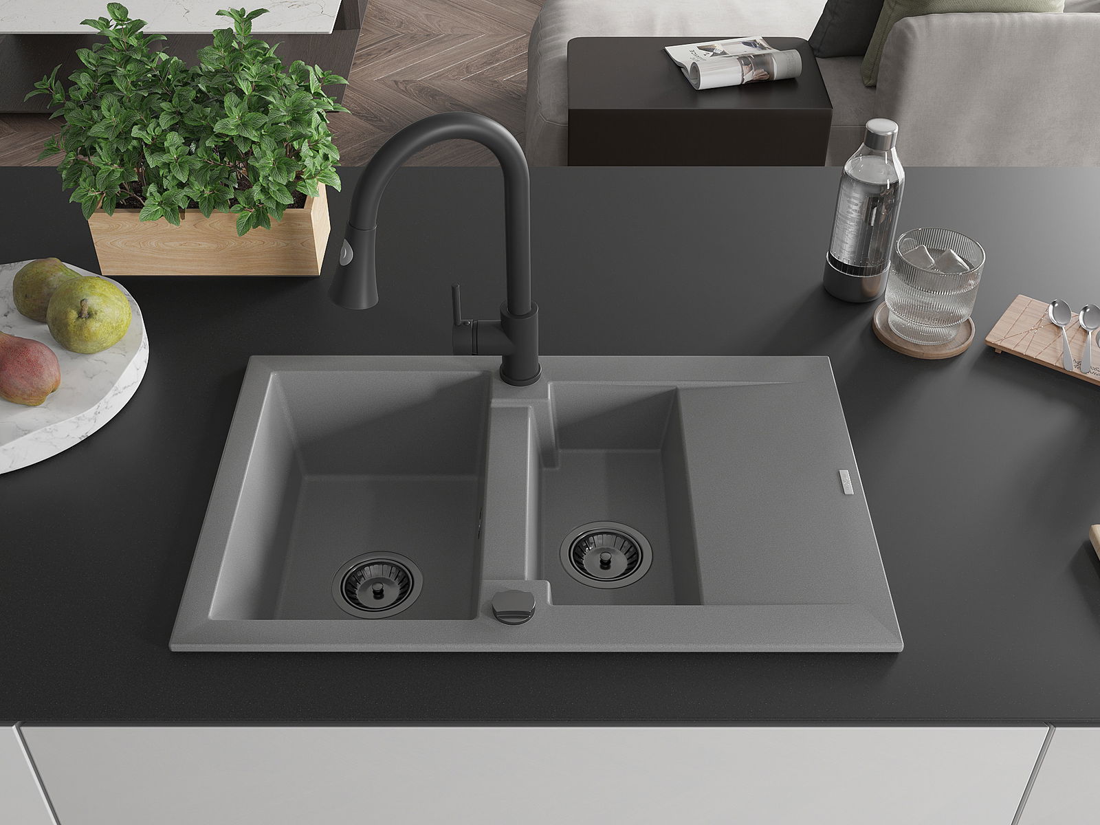 Mexen Gaspar zlewozmywak granitowy 1,5-komorowy z ociekaczem i baterią kuchenną Elia, szary - 6507-71-670101-70-B