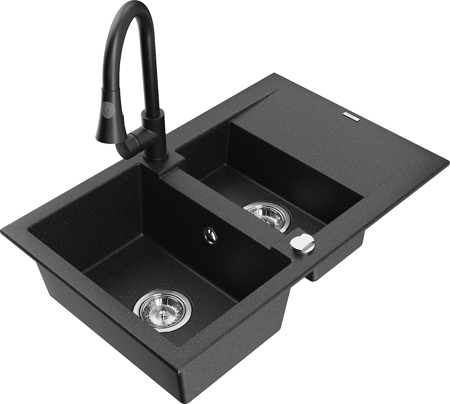 Mexen Gaspar zlewozmywak granitowy 1,5-komorowy z ociekaczem i baterią kuchenną Elia, czarny/srebrny metalik - 6507-73-670101-70