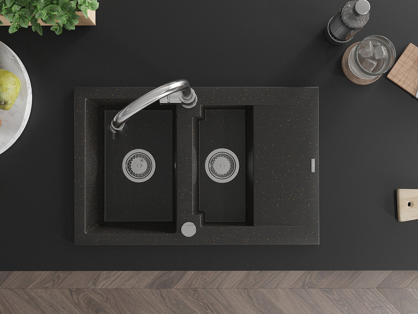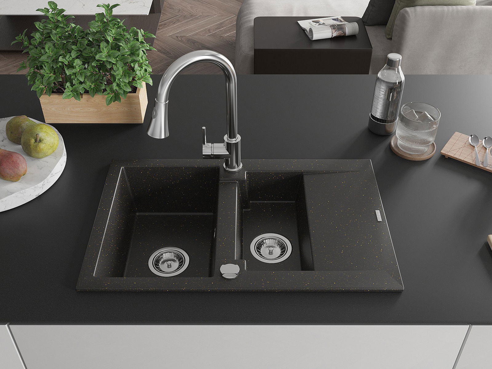 Mexen Gaspar zlewozmywak granitowy 1,5-komorowy z ociekaczem i baterią kuchenną Elia, czarny/złoty metalik - 6507-75-670101-00