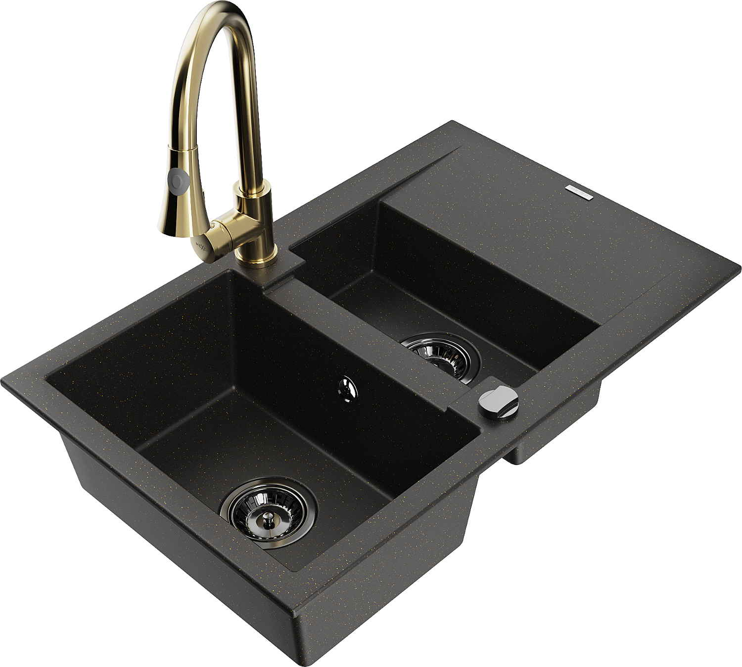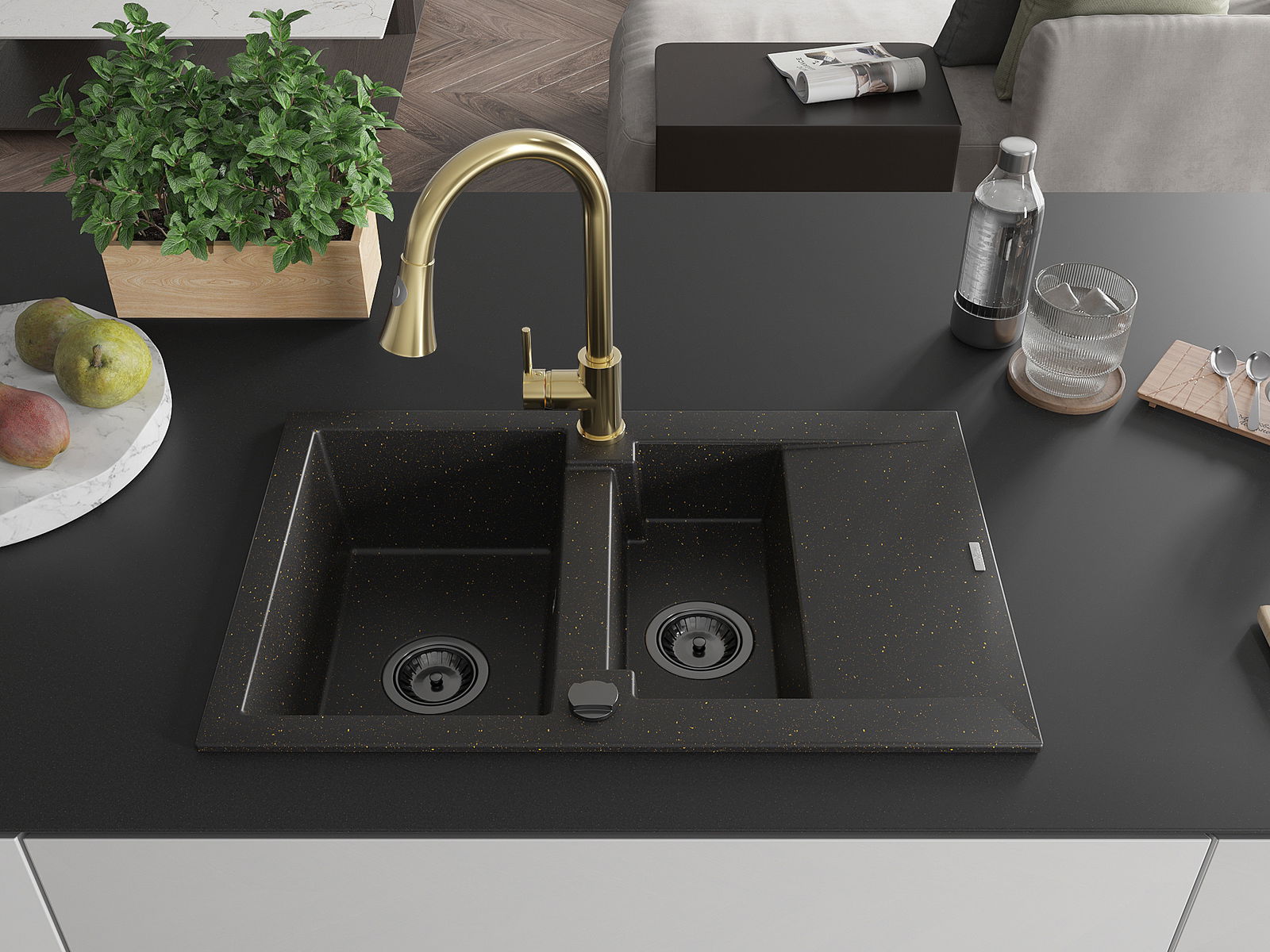 Mexen Gaspar zlewozmywak granitowy 1,5-komorowy z ociekaczem i baterią kuchenną Elia, czarny/złoty metalik - 6507-75-670101-50-B