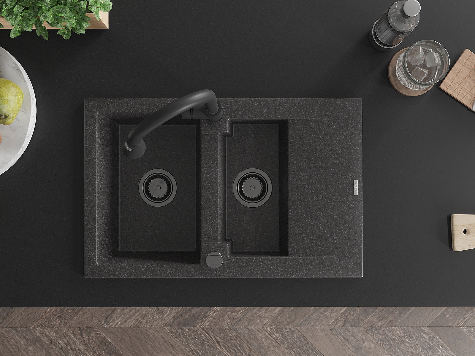 Mexen Gaspar zlewozmywak granitowy 1,5-komorowy z ociekaczem i baterią kuchenną Elia, czarny nakrapiany - 6507-76-670101-70-B
