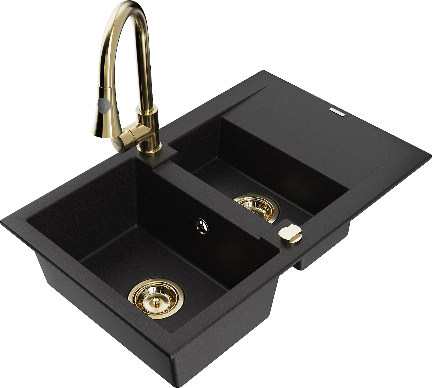 Mexen Gaspar zlewozmywak granitowy 1,5-komorowy z ociekaczem i baterią kuchenną Elia, czarny - 6507-77-670101-50
