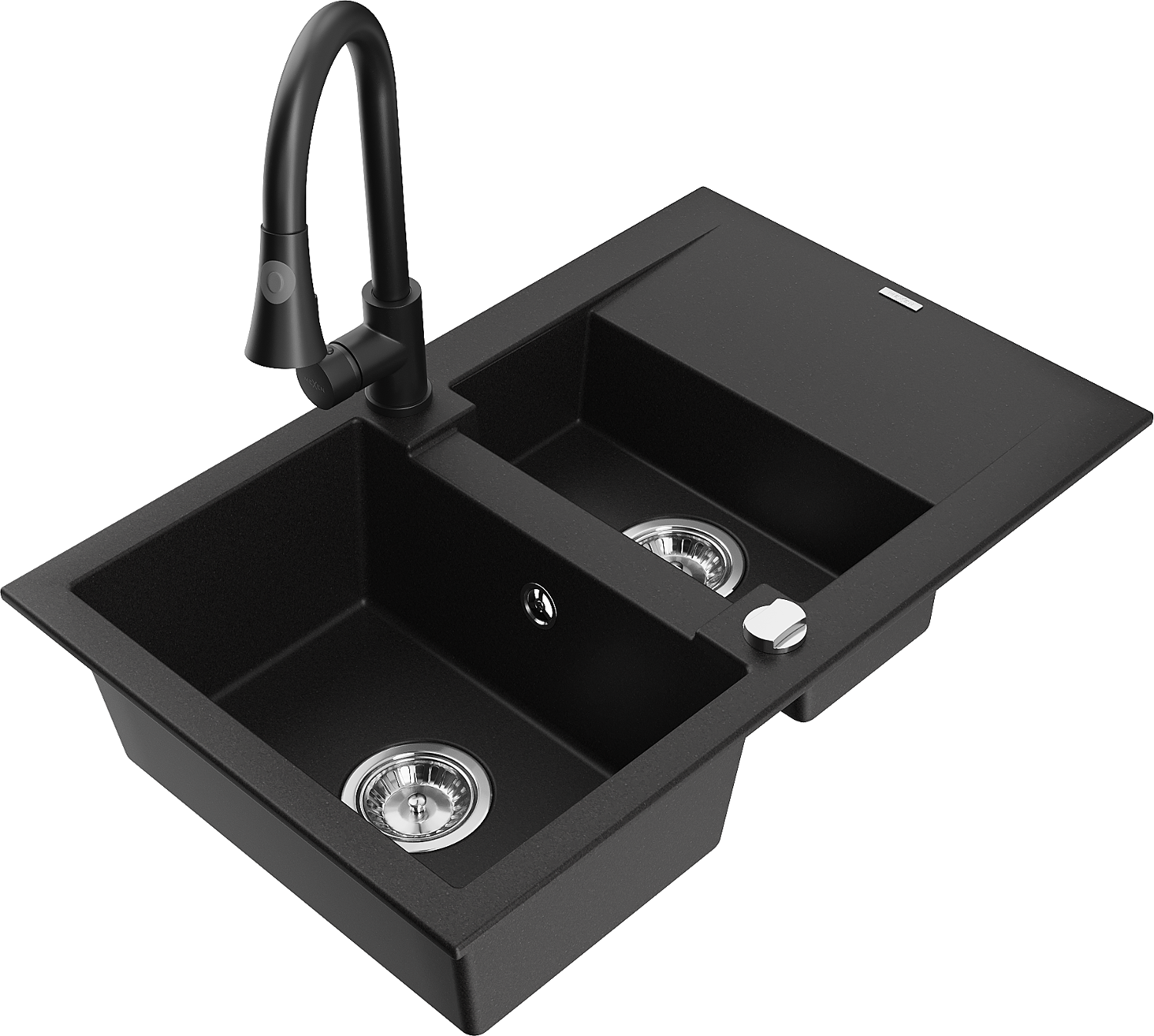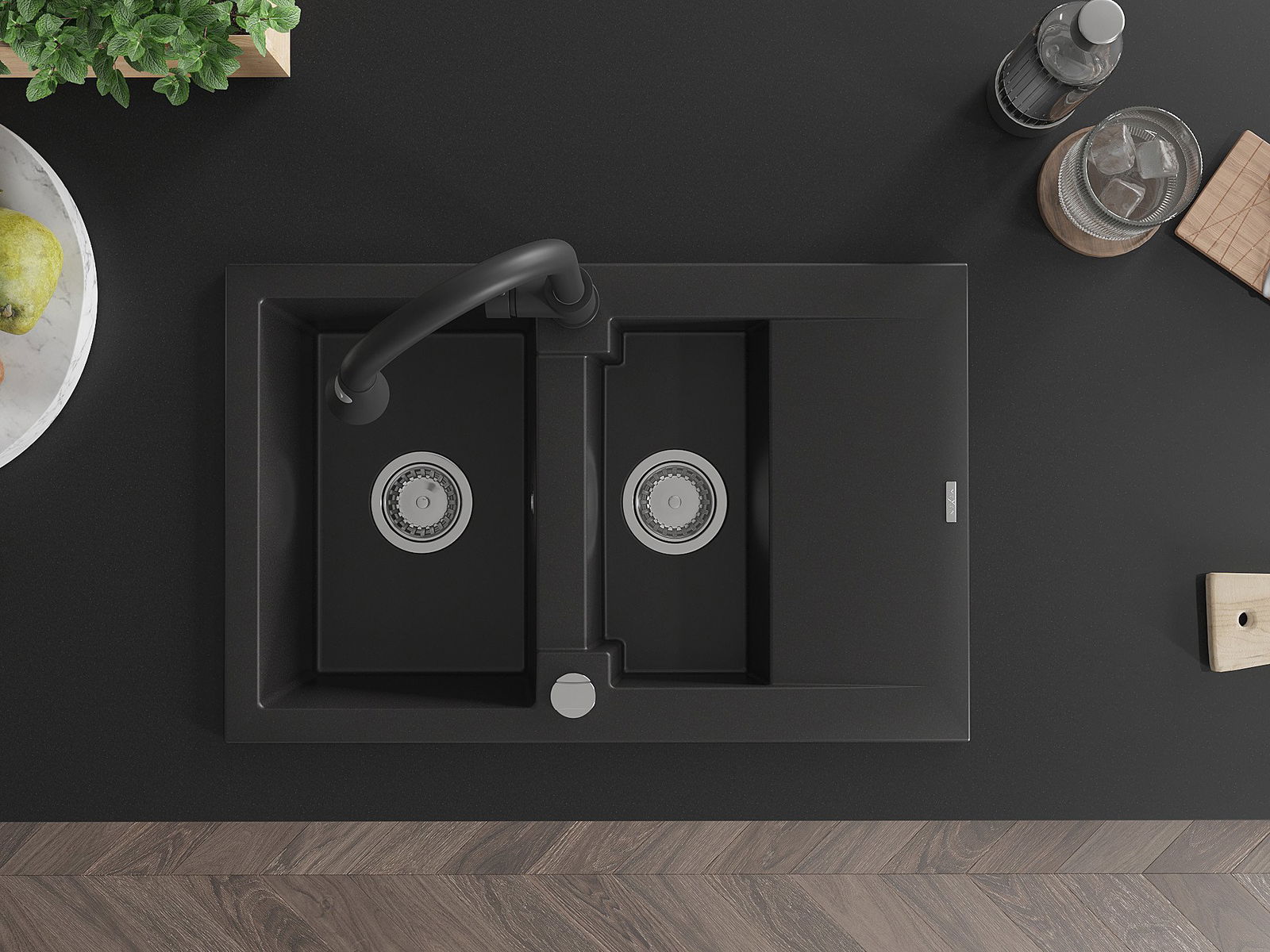 Mexen Gaspar zlewozmywak granitowy 1,5-komorowy z ociekaczem i baterią kuchenną Elia, czarny - 6507-77-670101-70