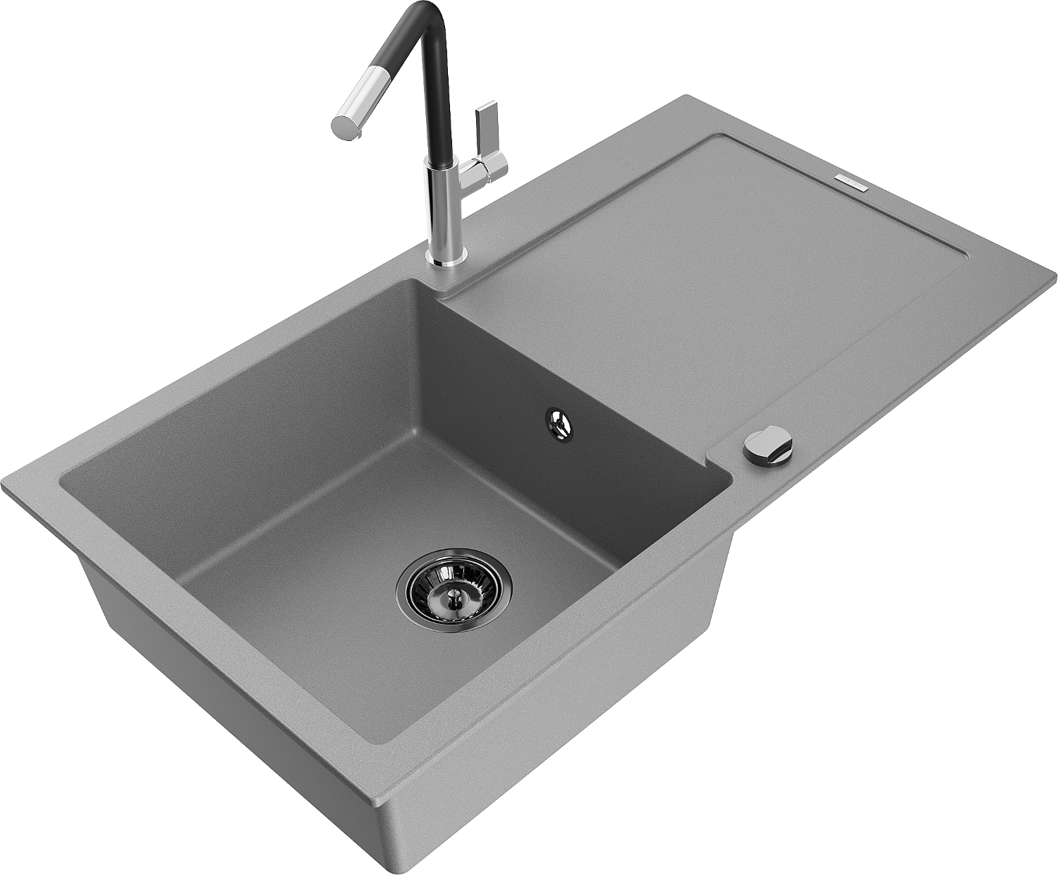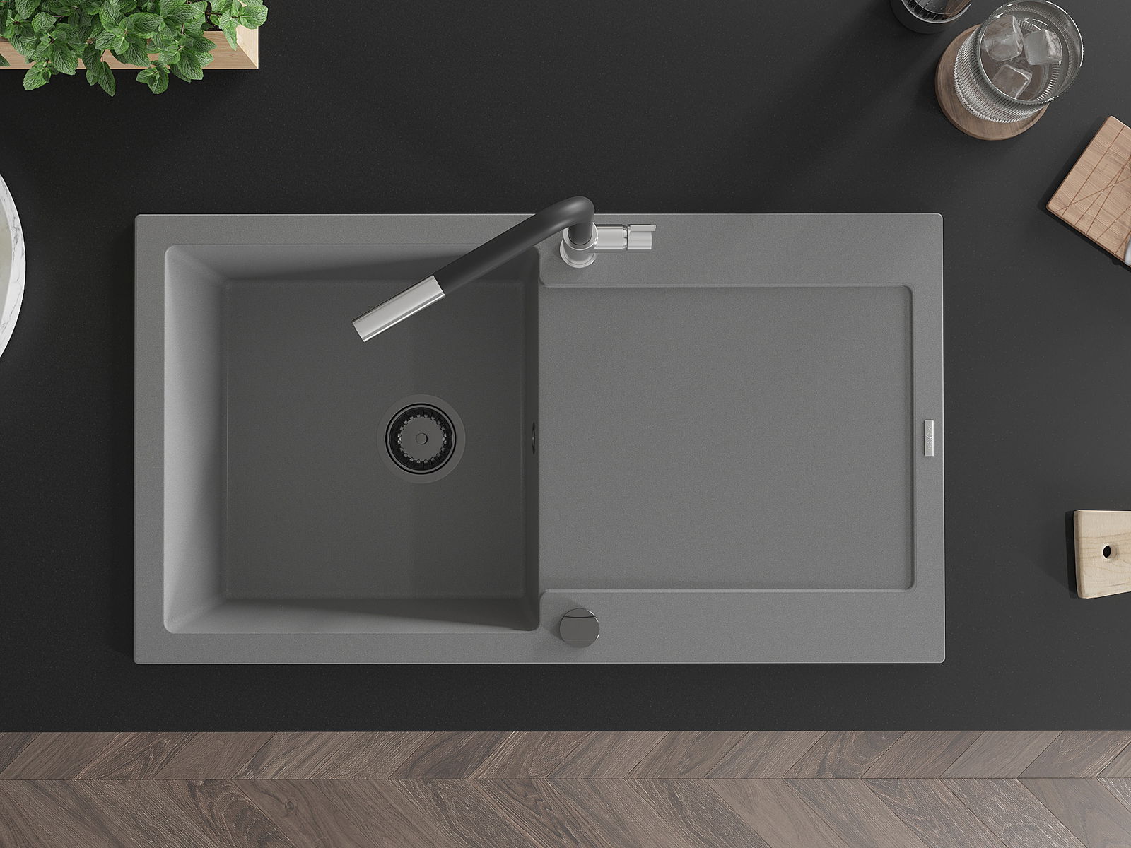 Mexen Leo zlewozmywak granitowy 1-komorowy z ociekaczem i baterią kuchenną Flora, szary - 6501-71-670401-07-B