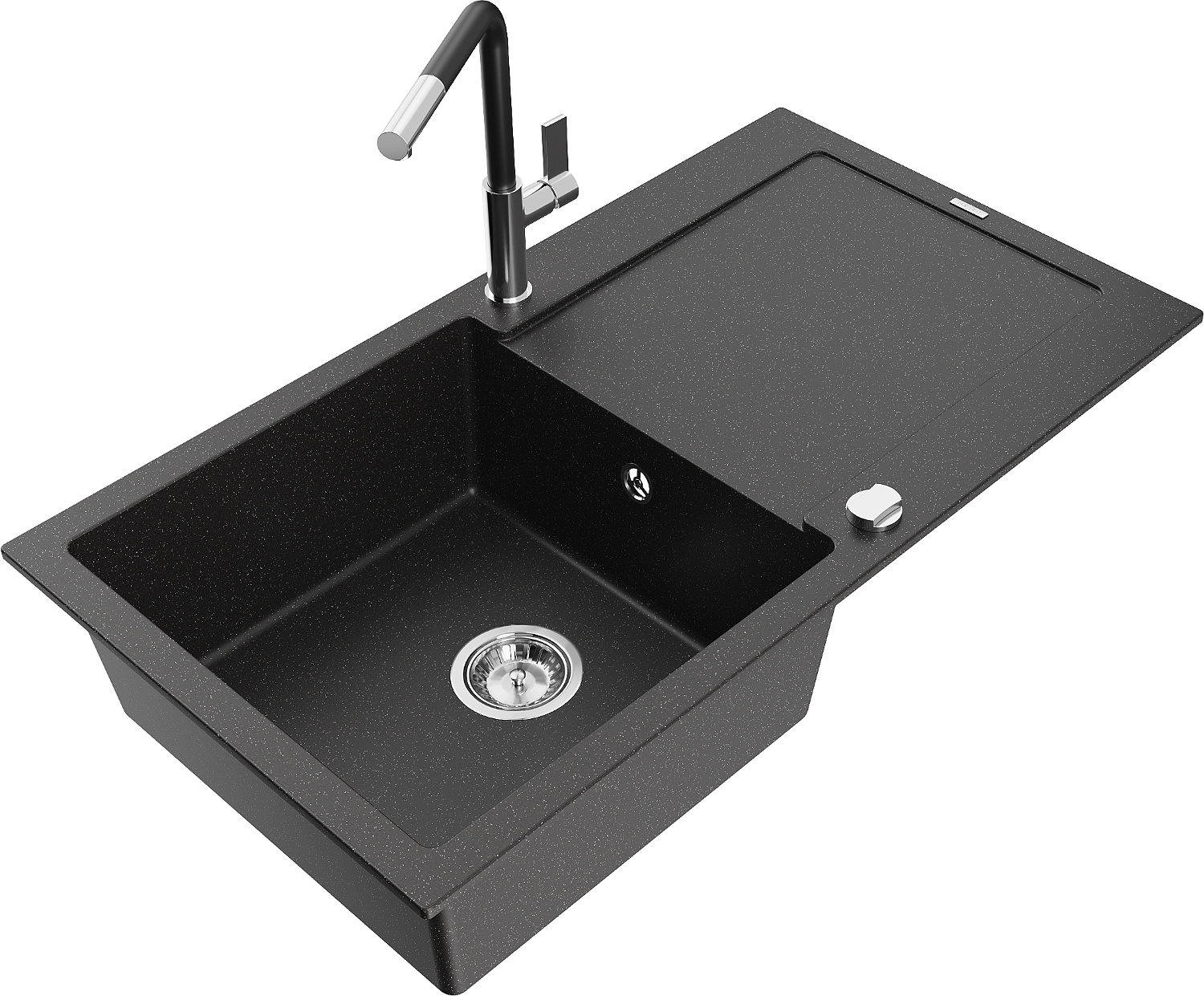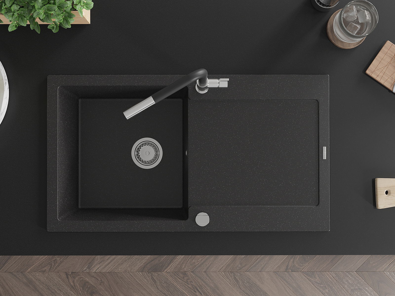 Mexen Leo zlewozmywak granitowy 1-komorowy z ociekaczem i baterią kuchenną Flora, czarny/srebrny metalik - 6501-73-670401-07