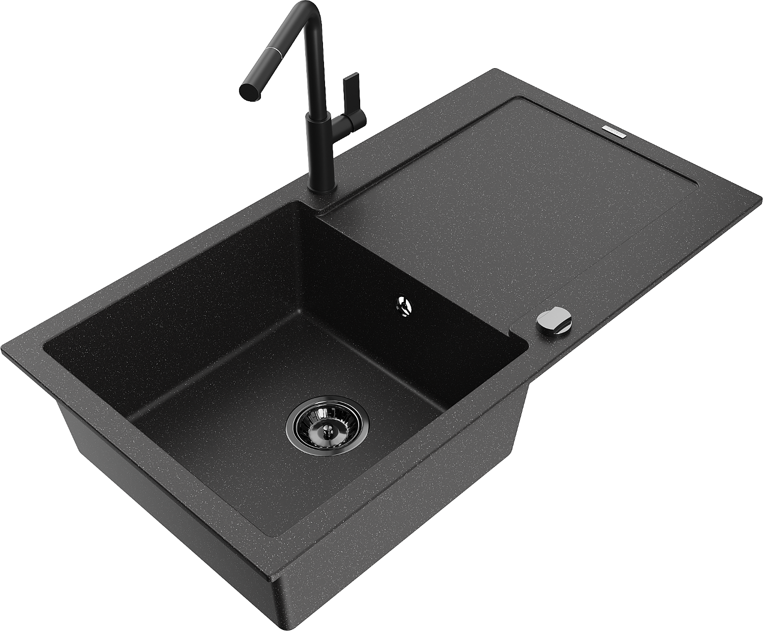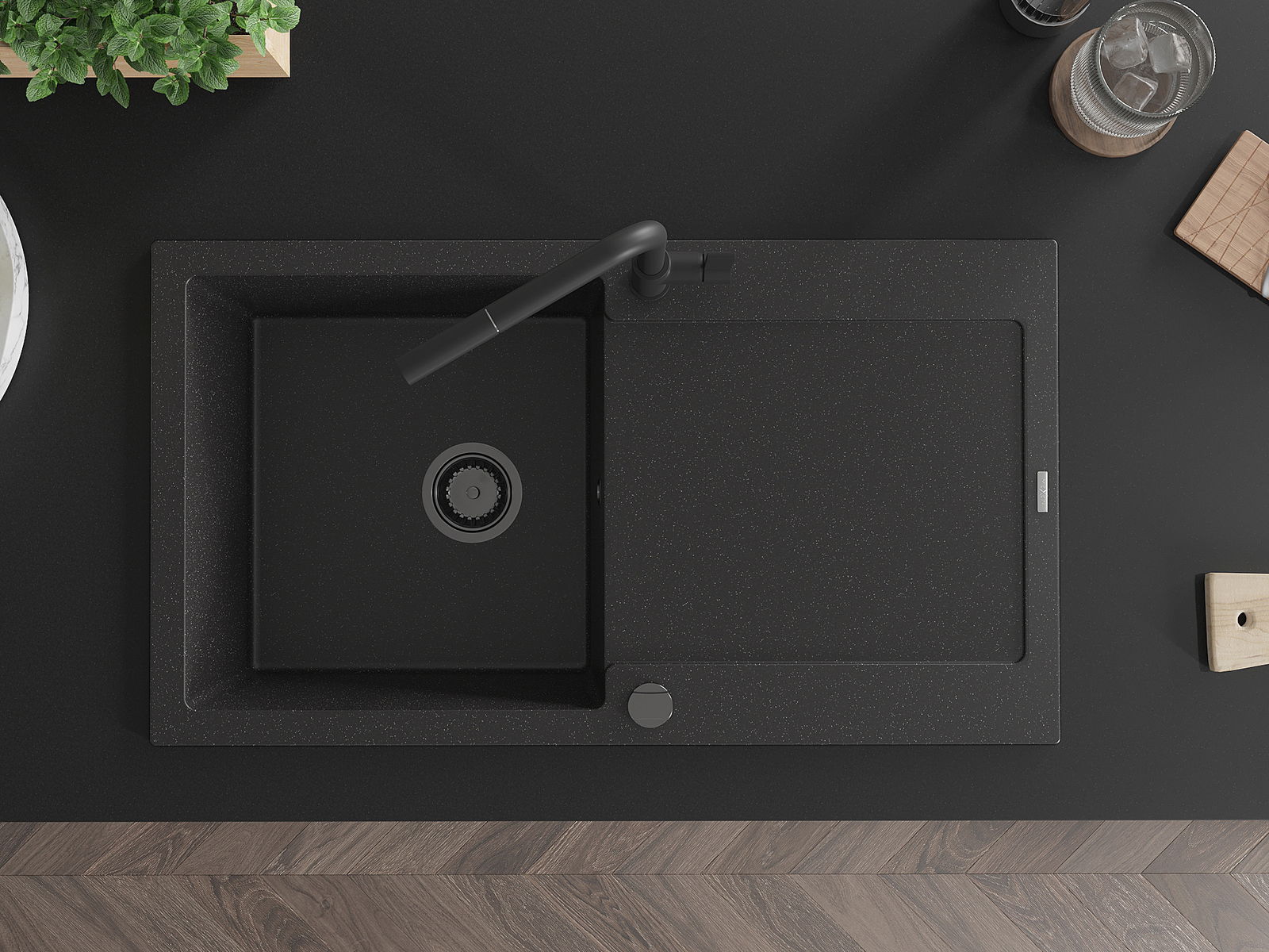 Mexen Leo zlewozmywak granitowy 1-komorowy z ociekaczem i baterią kuchenną Flora, czarny/srebrny metalik - 6501-73-670401-70-B