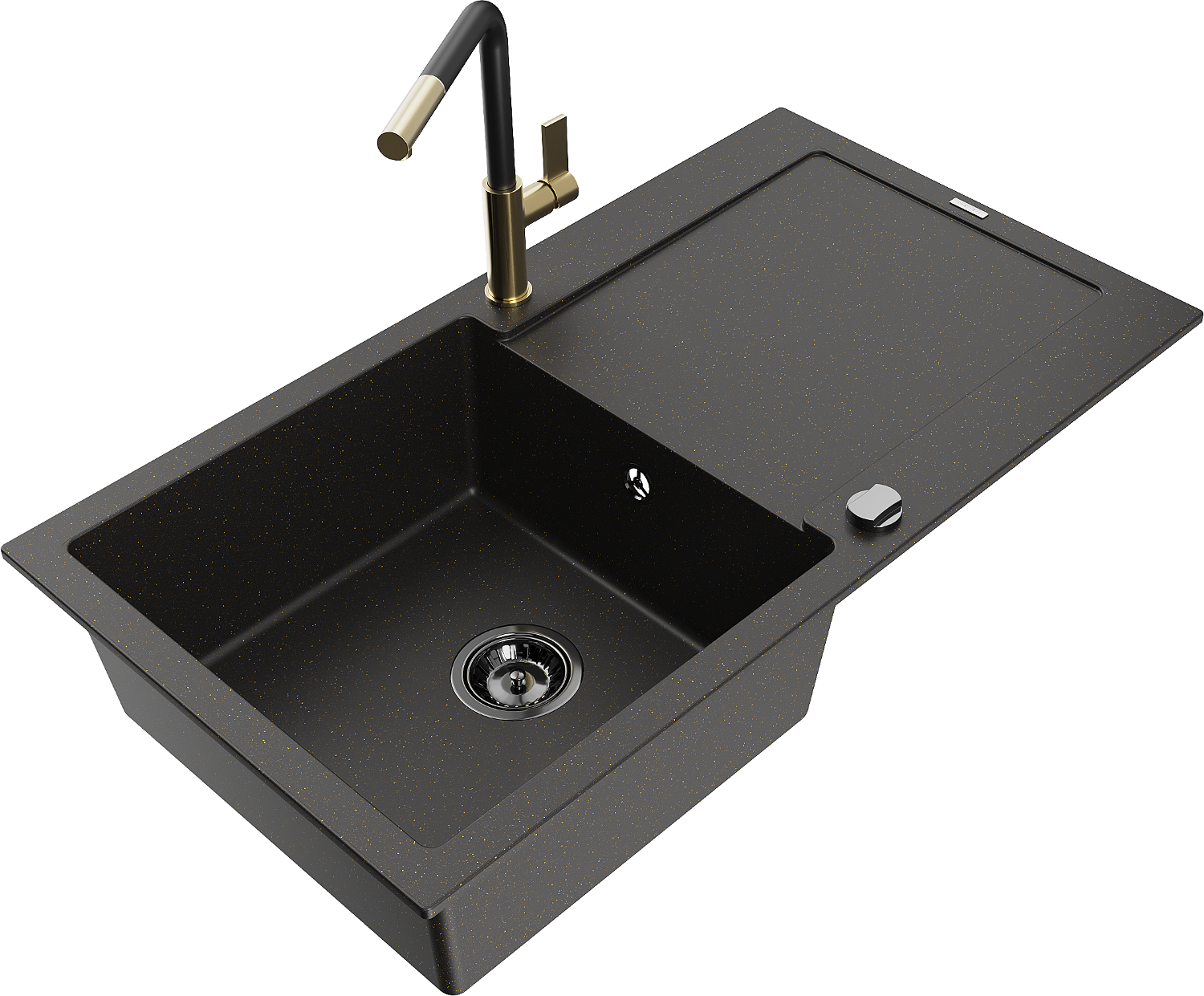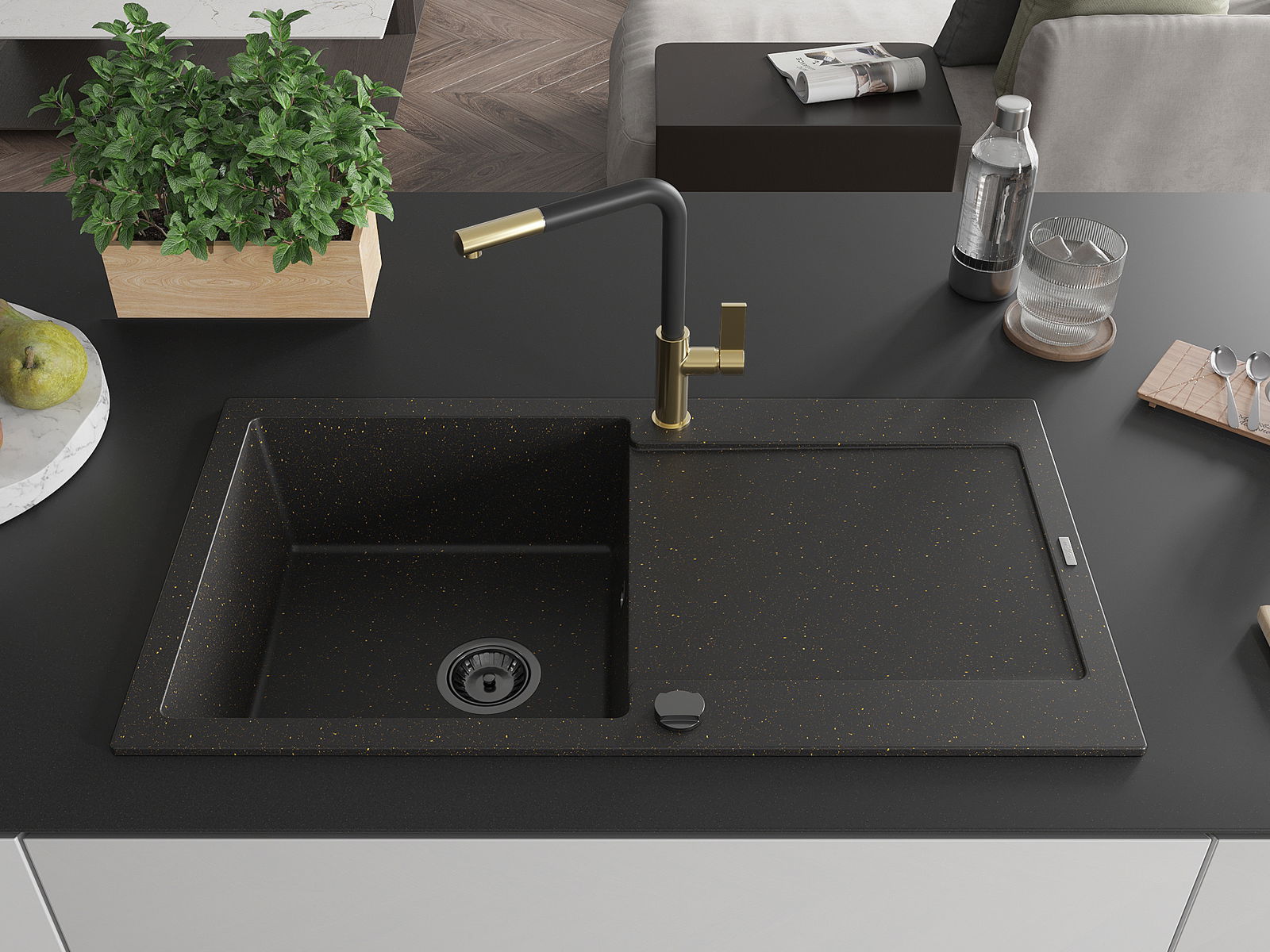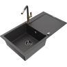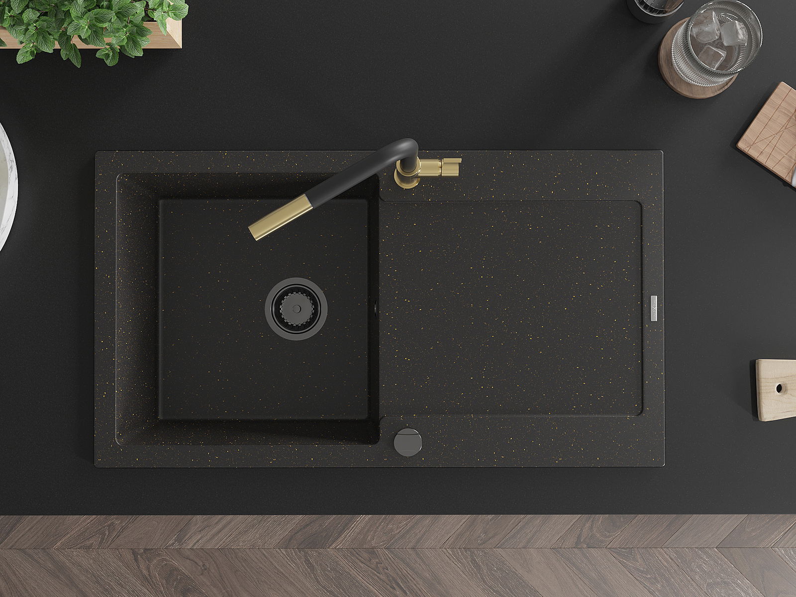 Mexen Leo zlewozmywak granitowy 1-komorowy z ociekaczem i baterią kuchenną Flora, czarny/złoty metalik - 6501-75-670401-57-B