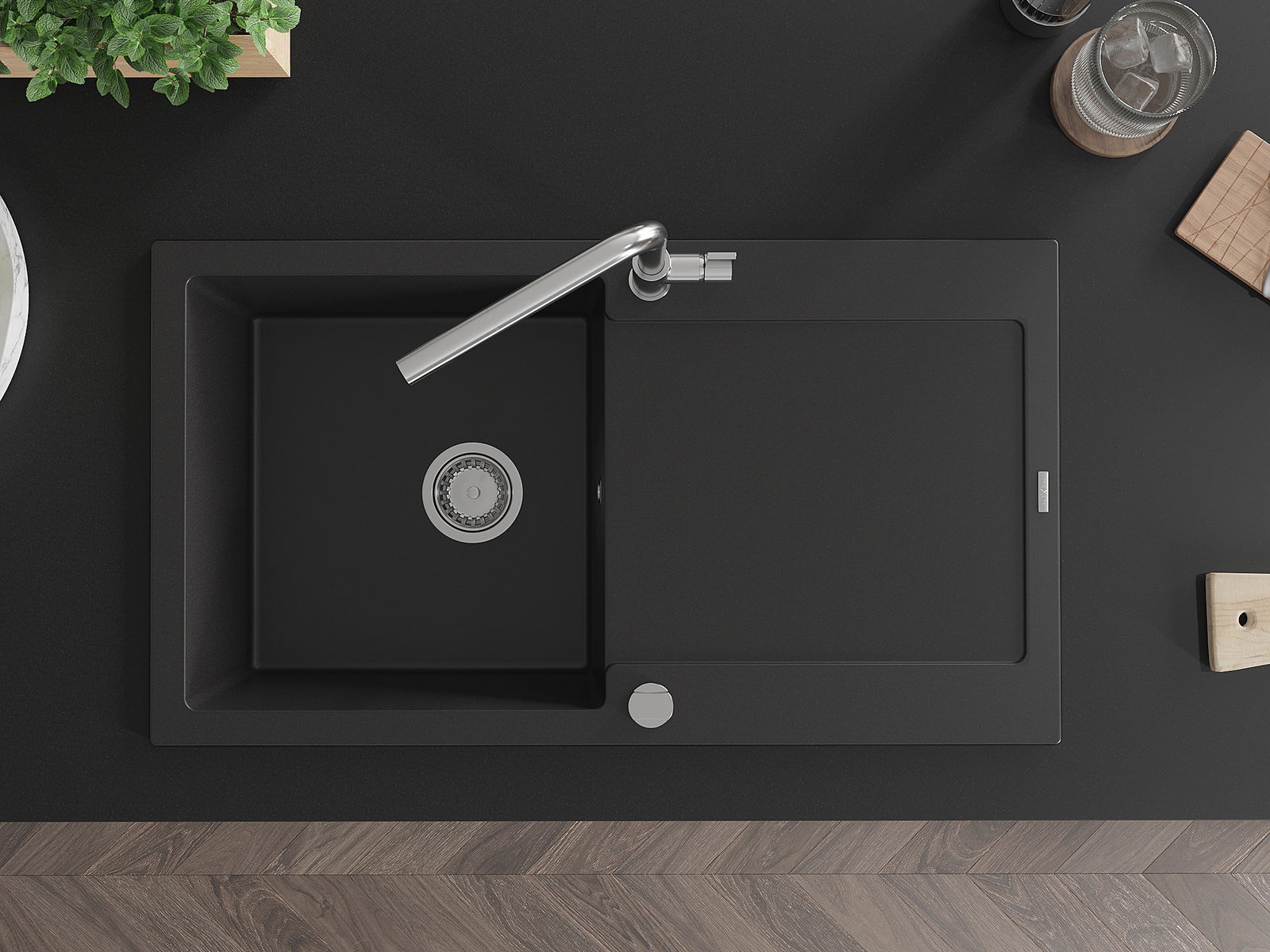 Mexen Leo zlewozmywak granitowy 1-komorowy z ociekaczem i baterią kuchenną Flora, czarny - 6501-77-670401-00