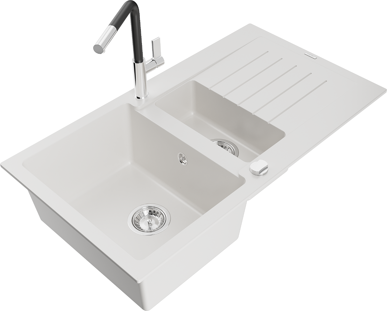 Mexen Matias zlewozmywak granitowy 1,5-komorowy z ociekaczem i baterią kuchenną Flora, biały - 6502-20-670401-07