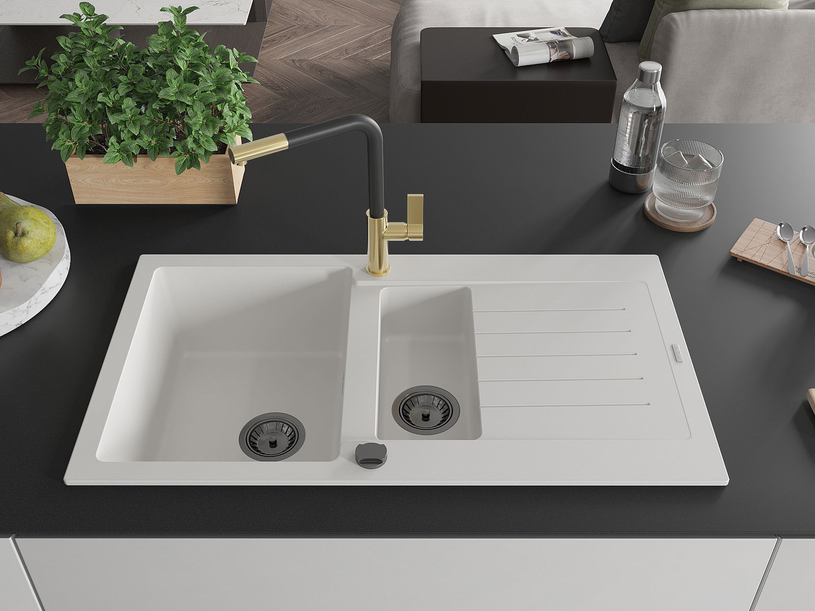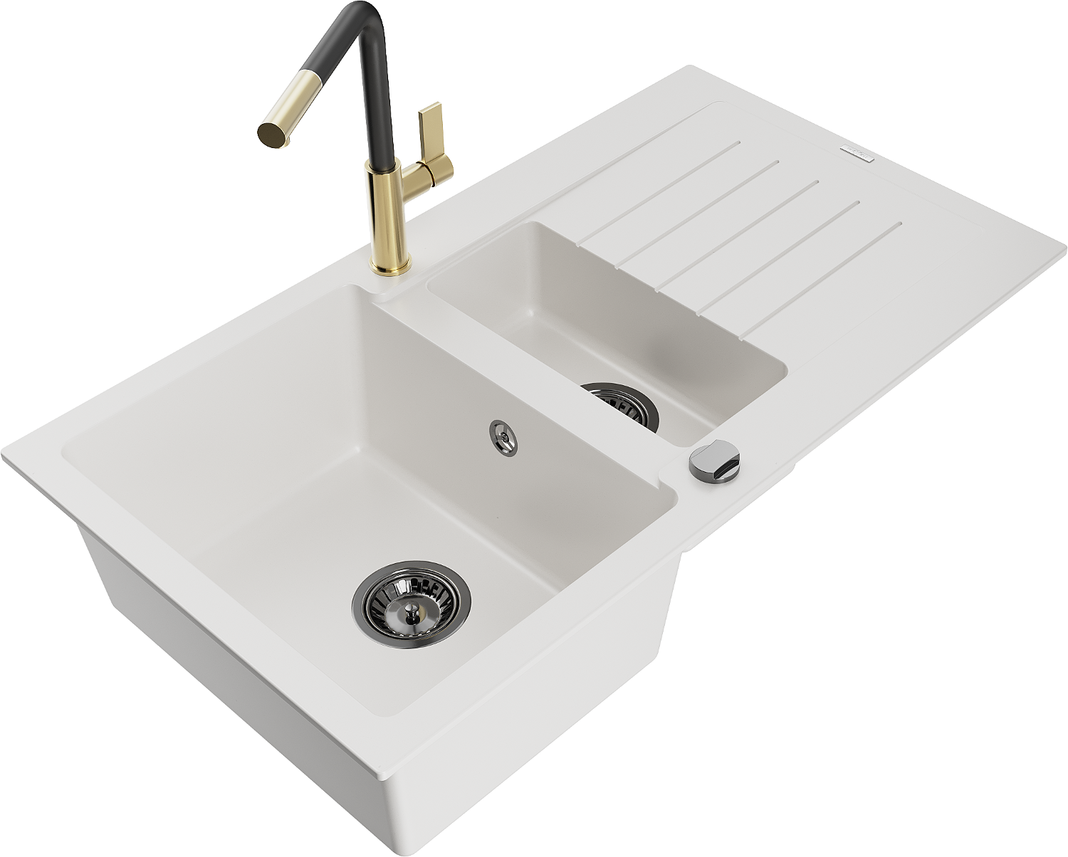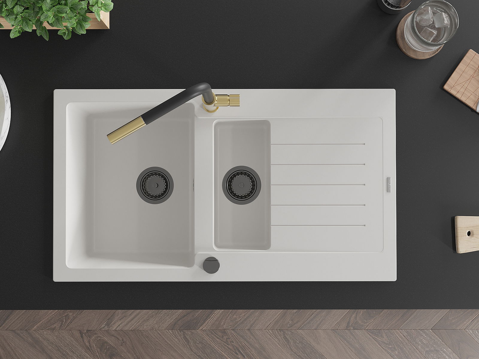 Mexen Matias zlewozmywak granitowy 1,5-komorowy z ociekaczem i baterią kuchenną Flora, biały - 6502-20-670401-57-B