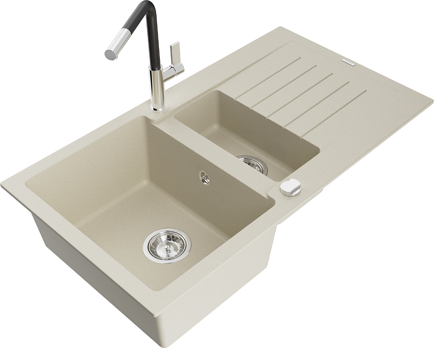 Mexen Matias zlewozmywak granitowy 1,5-komorowy z ociekaczem i baterią kuchenną Flora, beżowy - 6502-69-670401-07