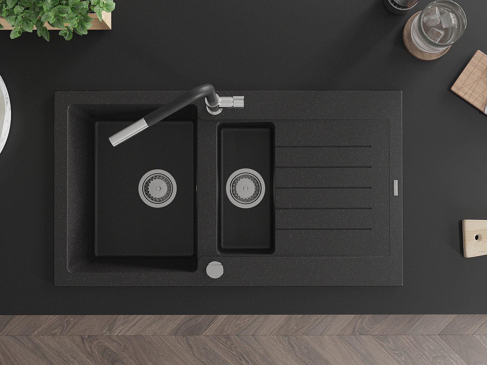 Mexen Matias zlewozmywak granitowy 1,5-komorowy z ociekaczem i baterią kuchenną Flora, czarny/srebrny - 6502-73-670401-07