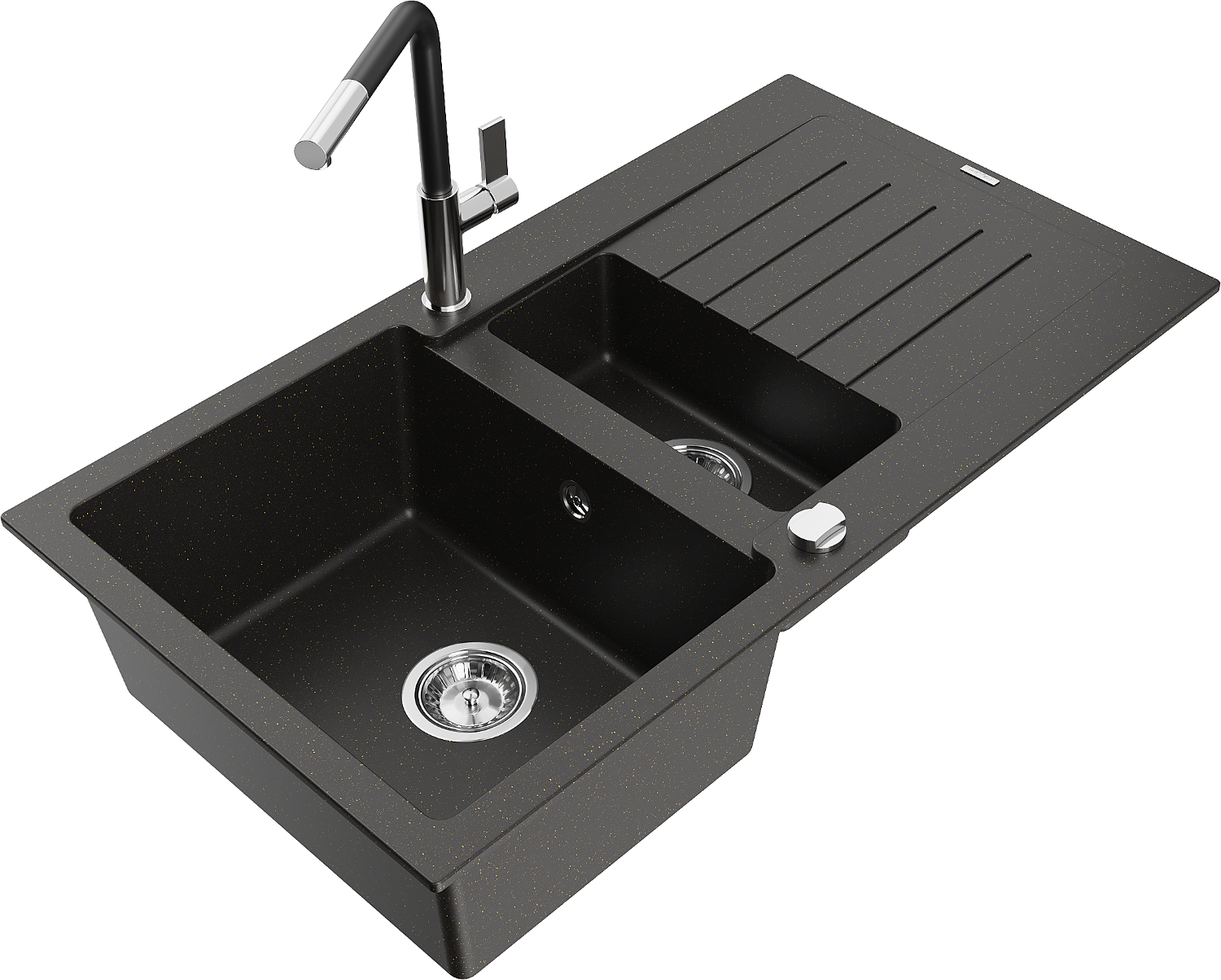 Mexen Matias zlewozmywak granitowy 1,5-komorowy z ociekaczem i baterią kuchenną Flora, czarny/złoty metalik - 6502-75-670401-07