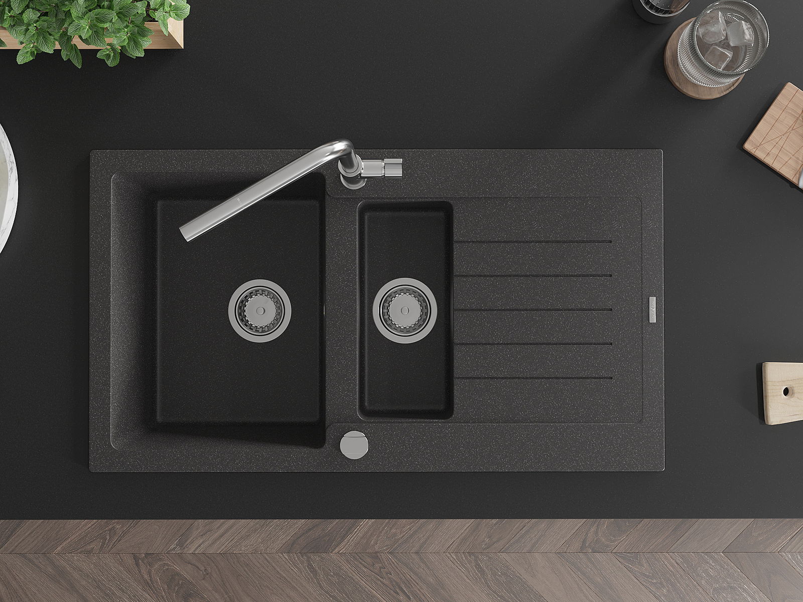 Dzięki zastosowaniu uniwersalnego systemu mocowania, zlew jest odwracalny, a ociekacz może zostać zamontowany na blacie po lewej lub prawej stronie. W ten sposób możesz z łatwością dopasować stronę do swoich potrzeb i warunków.
