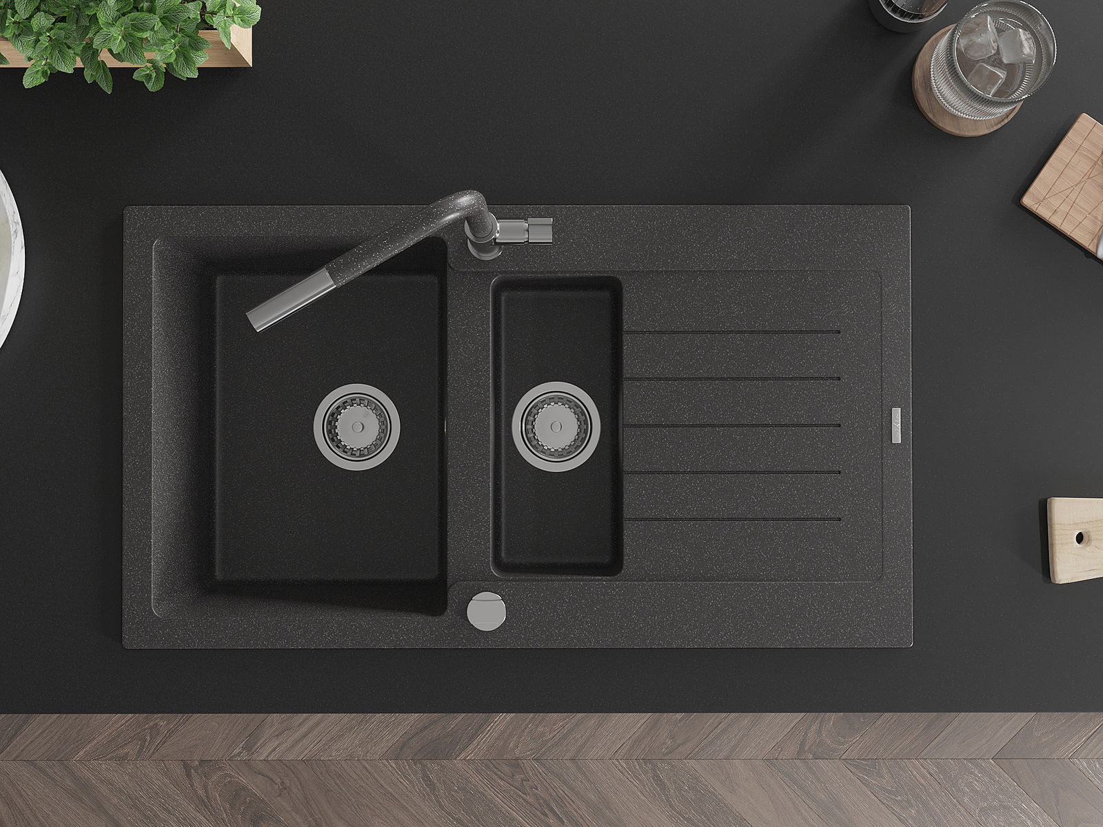 Mexen Matias zlewozmywak granitowy 1,5-komorowy z ociekaczem i baterią kuchenną Flora, czarny nakrapiany - 6502-76-670401-08