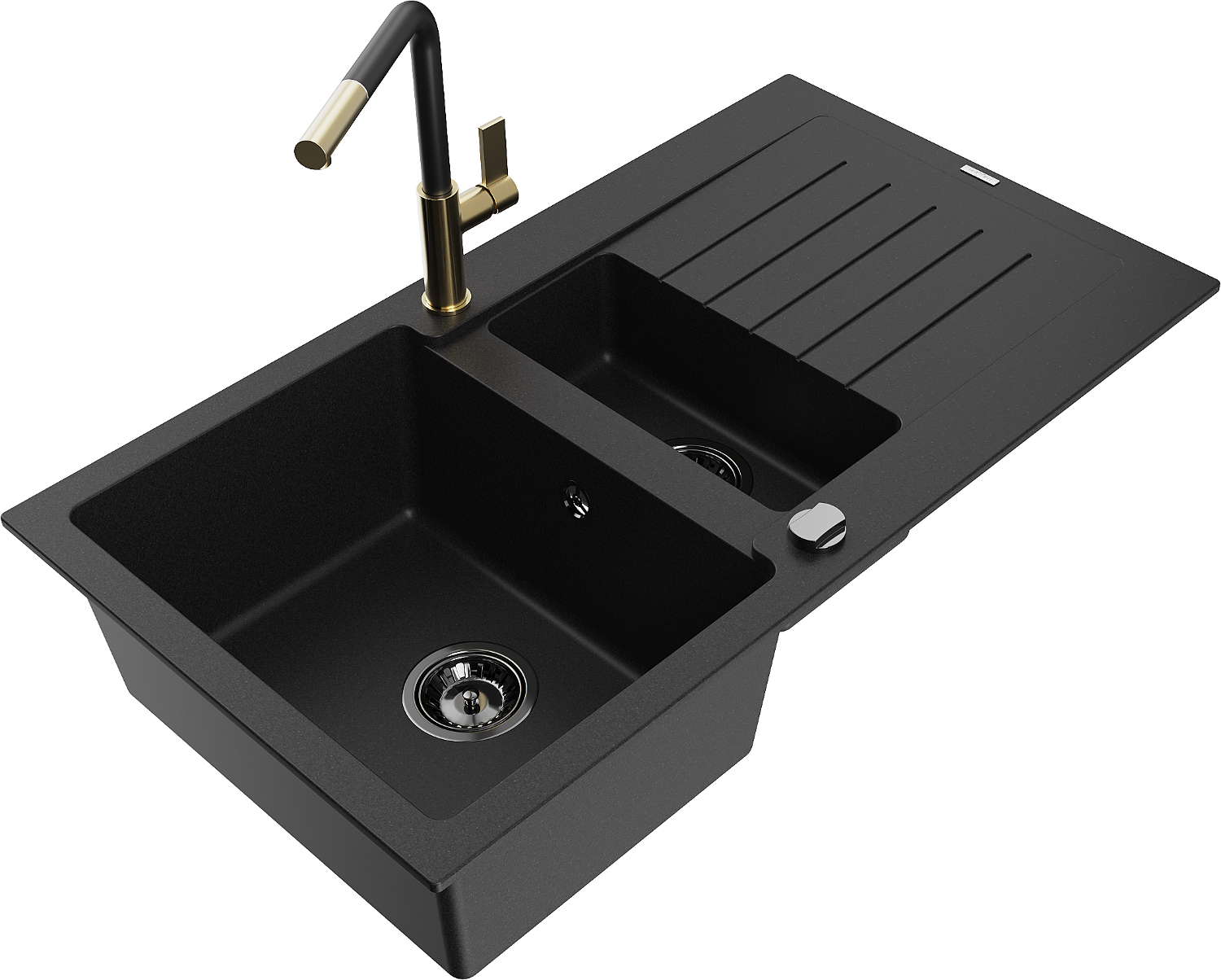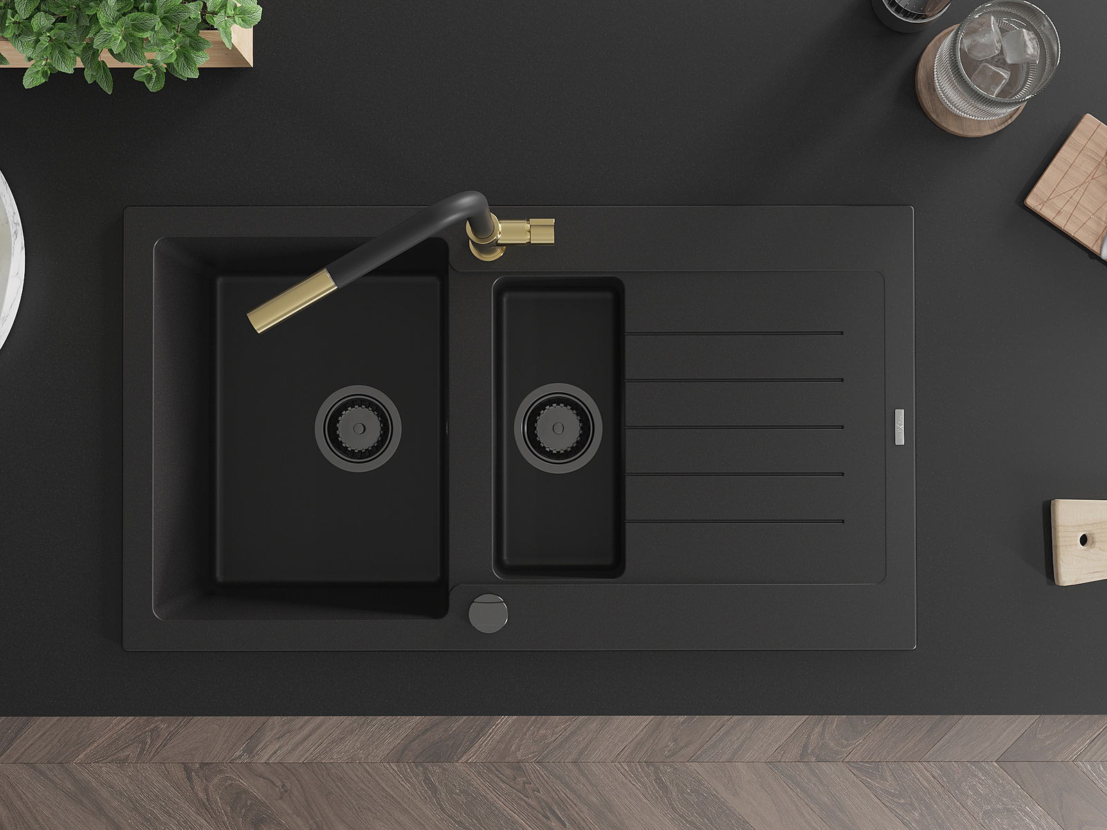 Mexen Matias zlewozmywak granitowy 1,5-komorowy z ociekaczem i baterią kuchenną Flora, czarny - 6502-77-670401-57-B