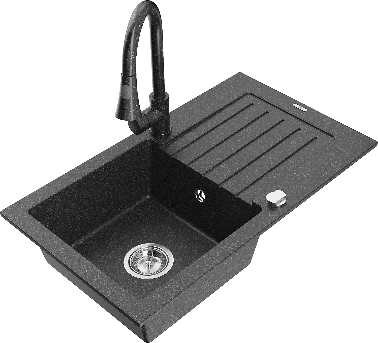 Mexen Pablo zlewozmywak granitowy 1-komorowy z ociekaczem i baterią kuchenną Elia, czarny nakrapiany - 6510-76-670101-76