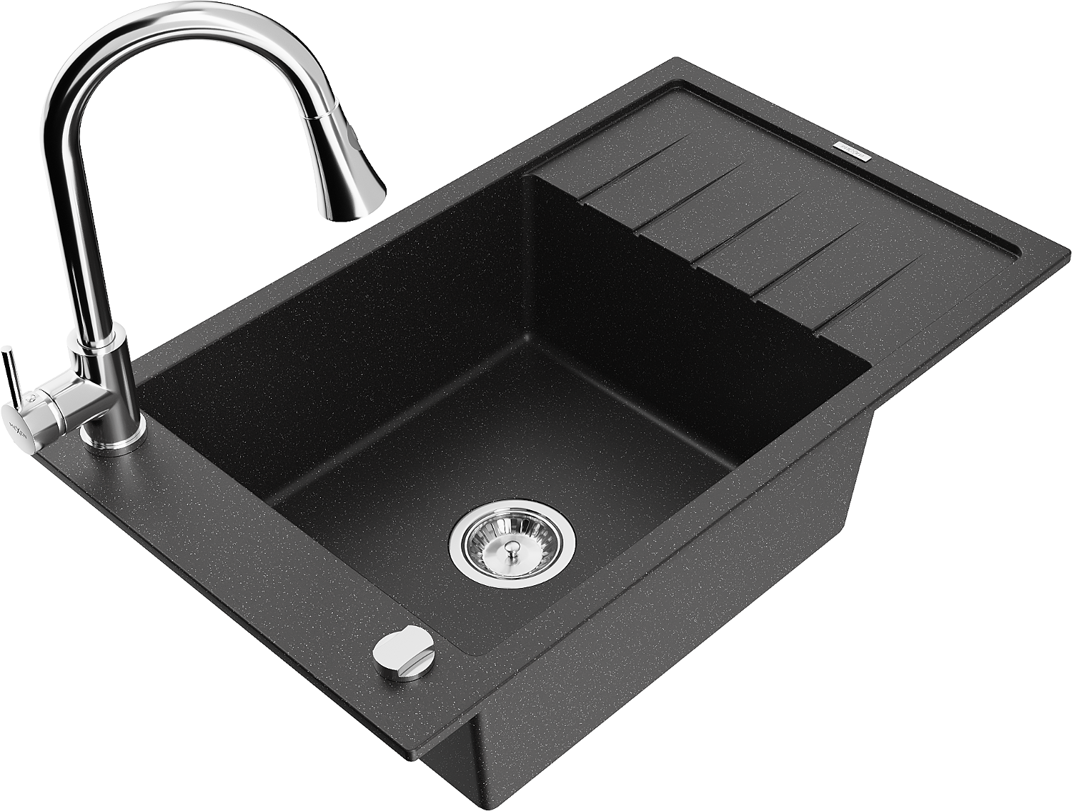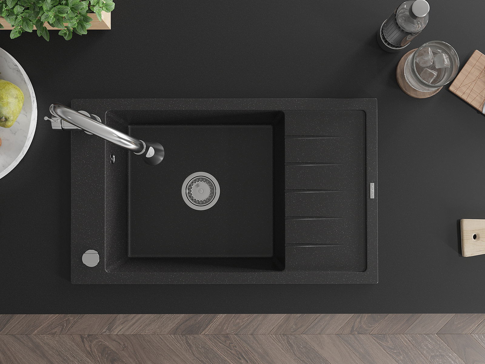 Mexen Elias zlewozmywak granitowy 1-komorowy z ociekaczem i baterią kuchenną Elia, czarny/srebrny metalik - 6511-73-670101-00
