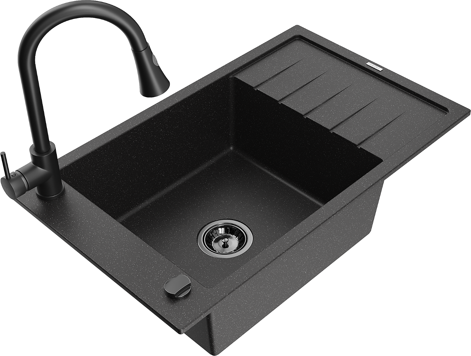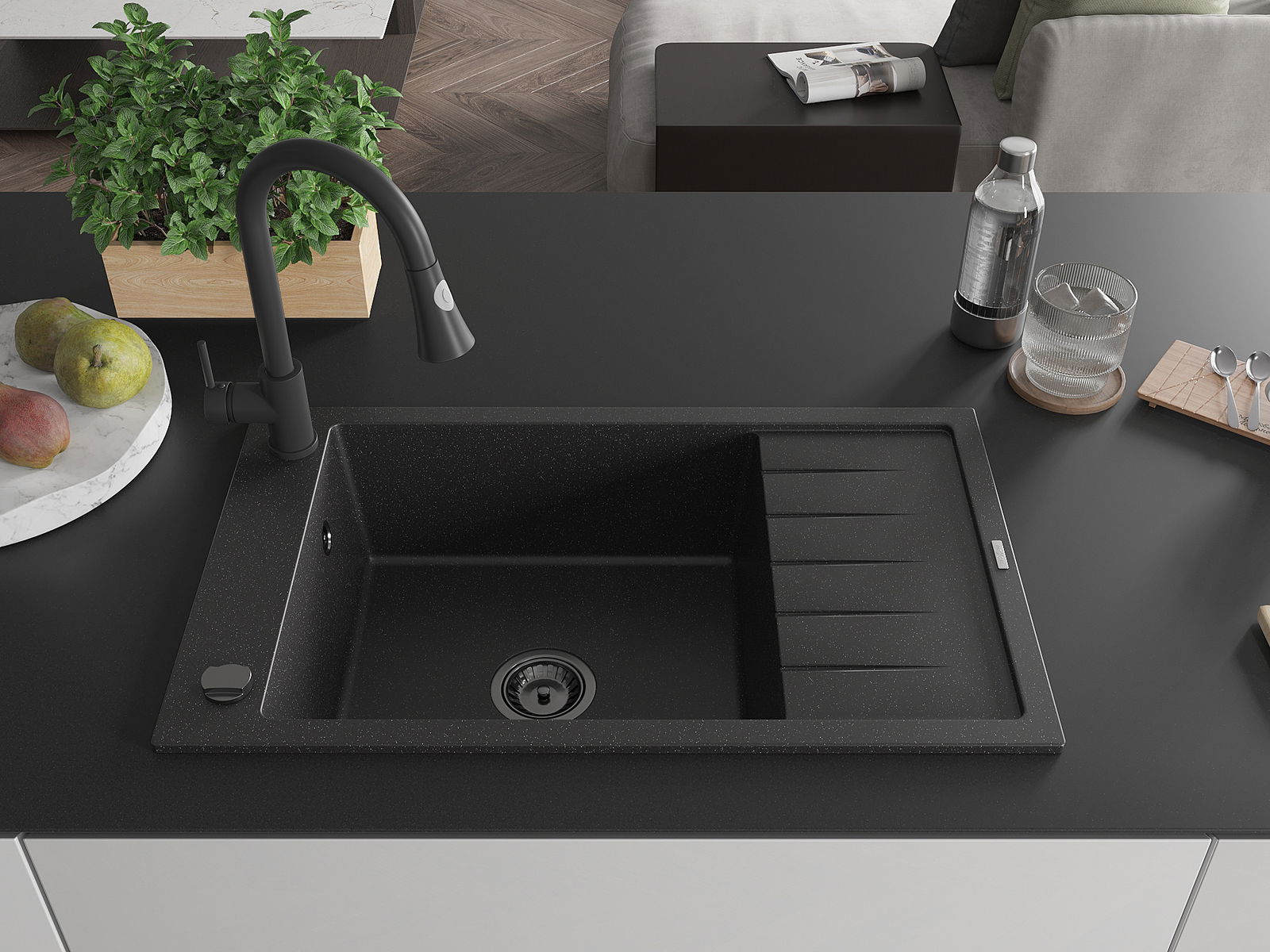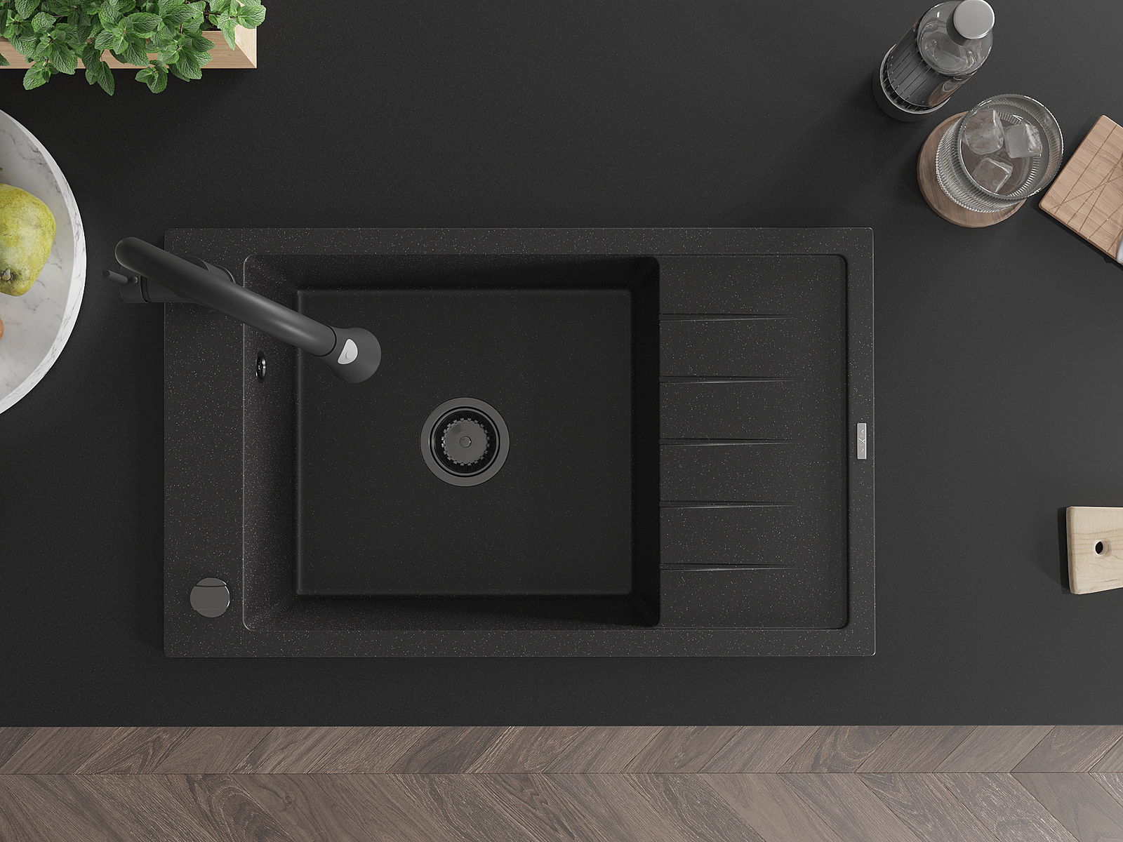 Mexen Elias zlewozmywak granitowy 1-komorowy z ociekaczem i baterią kuchenną Elia, czarny/srebrny metalik - 6511-73-670101-70-B