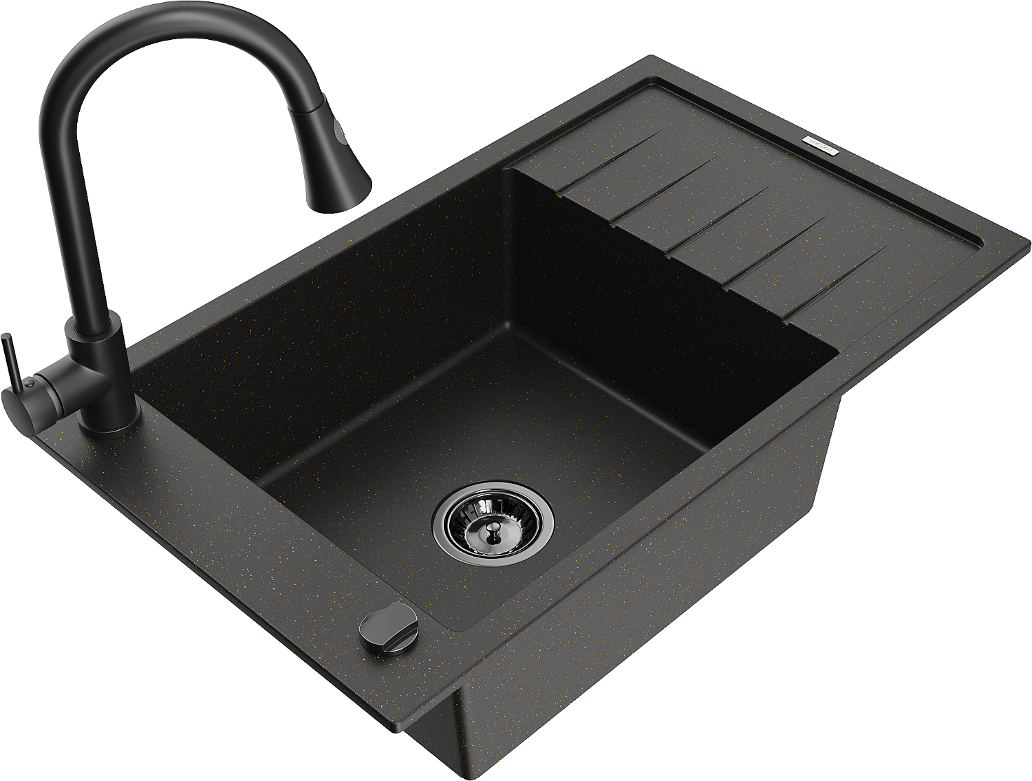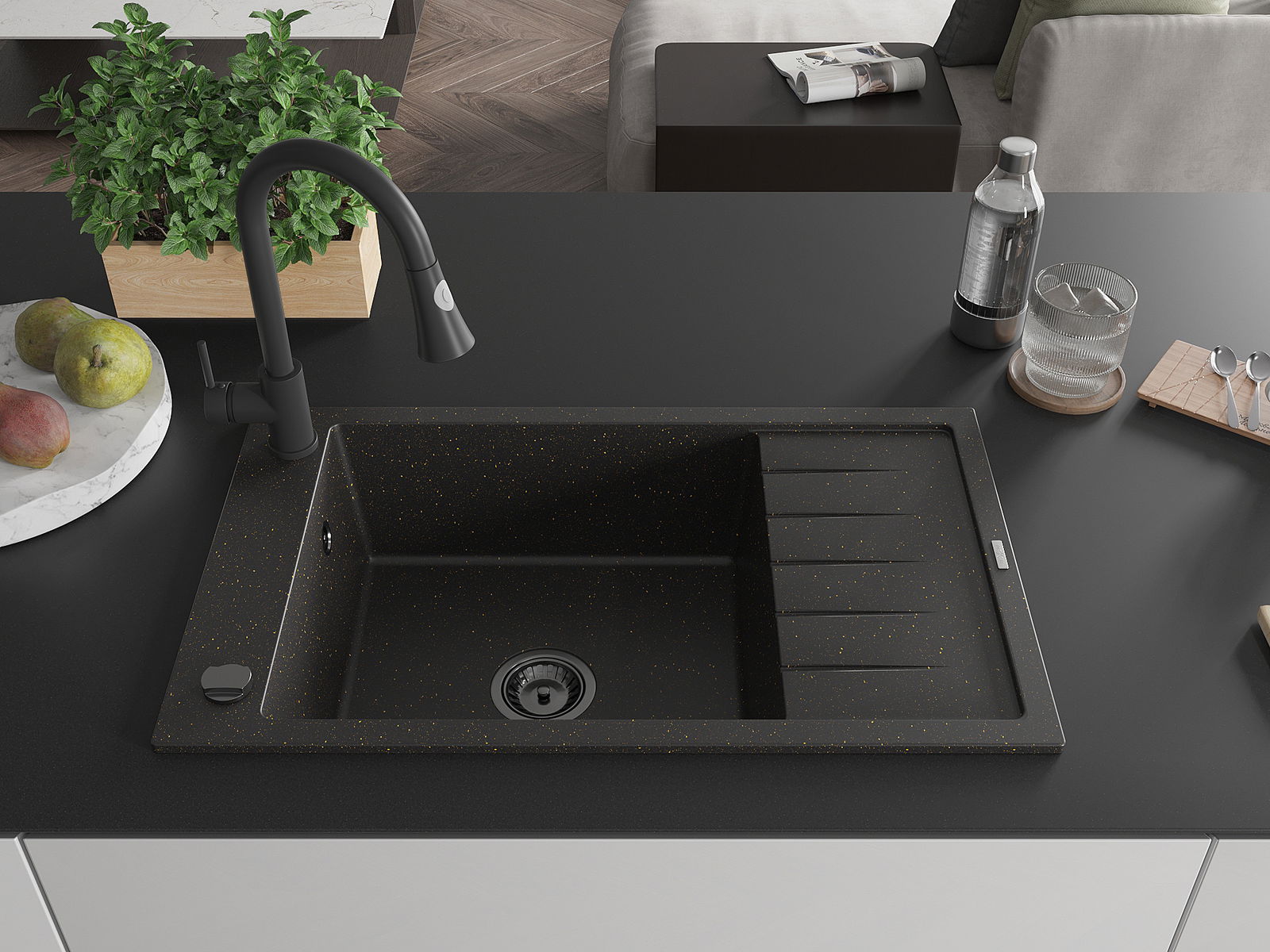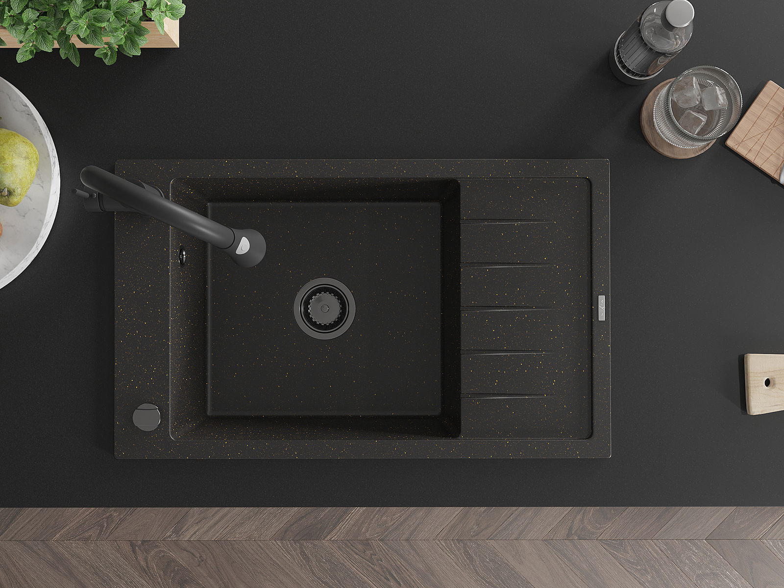 Mexen Elias zlewozmywak granitowy 1-komorowy z ociekaczem i baterią kuchenną Elia, czarny/złoty metalik - 6511-75-670101-70-B
