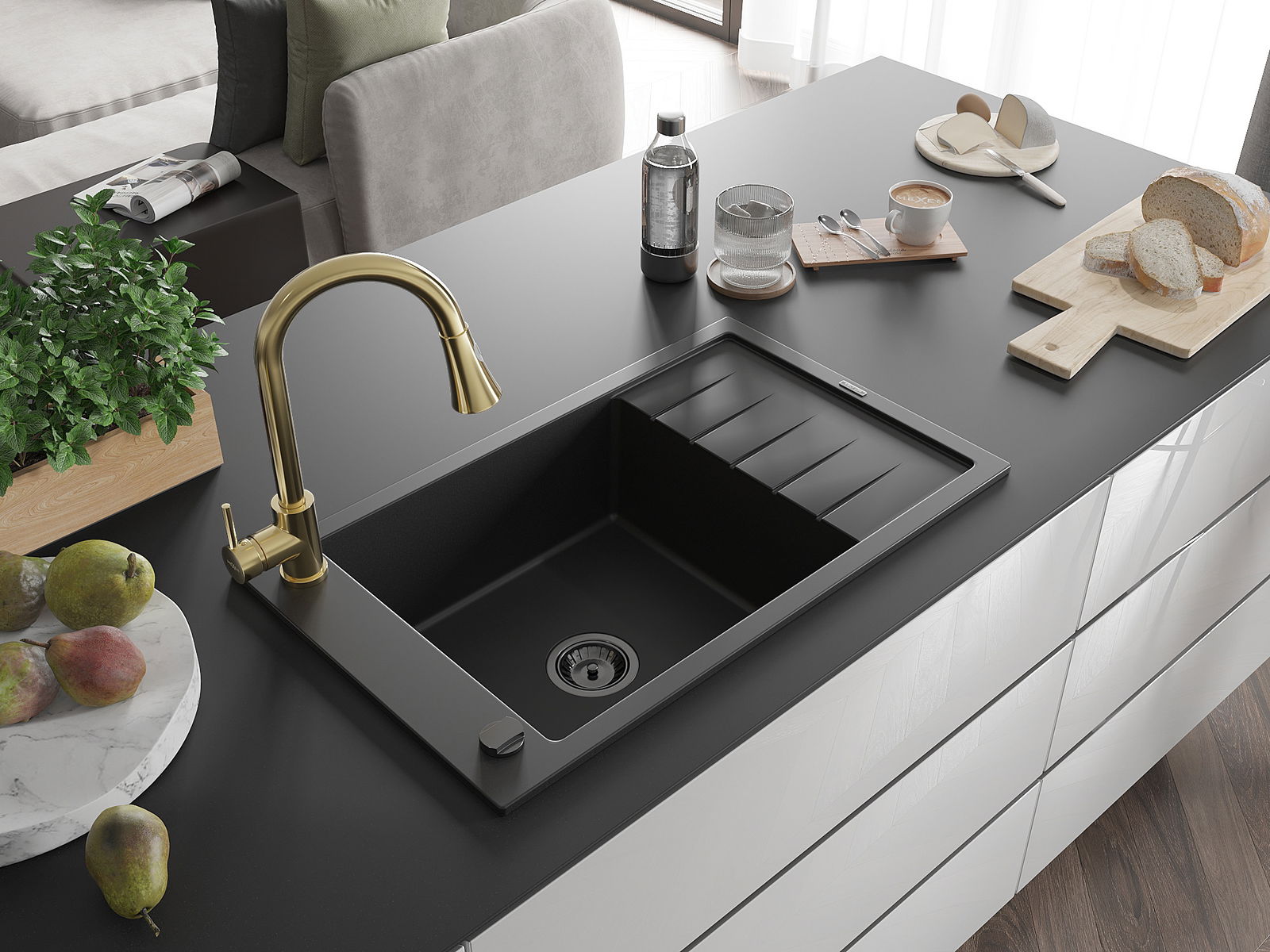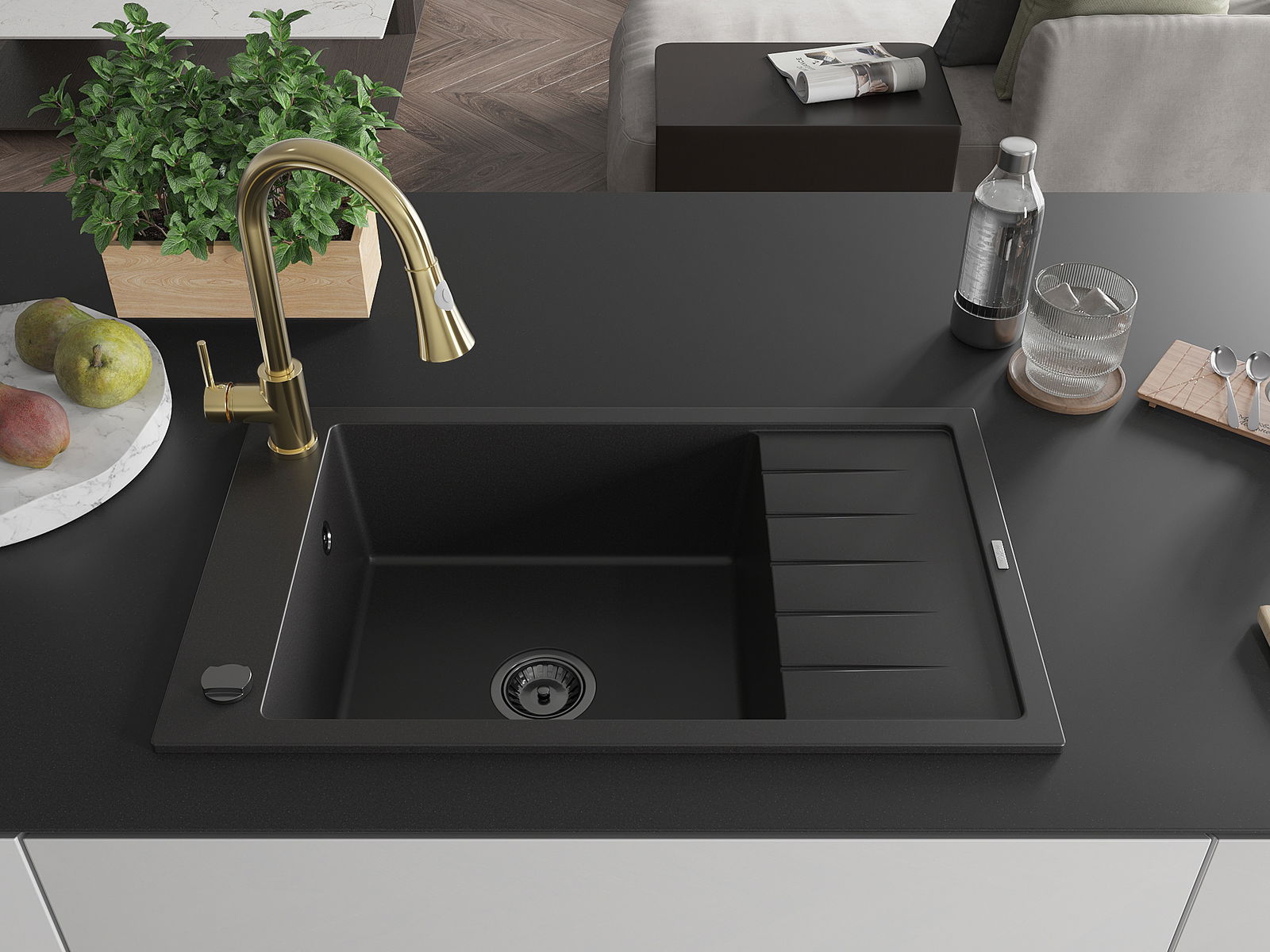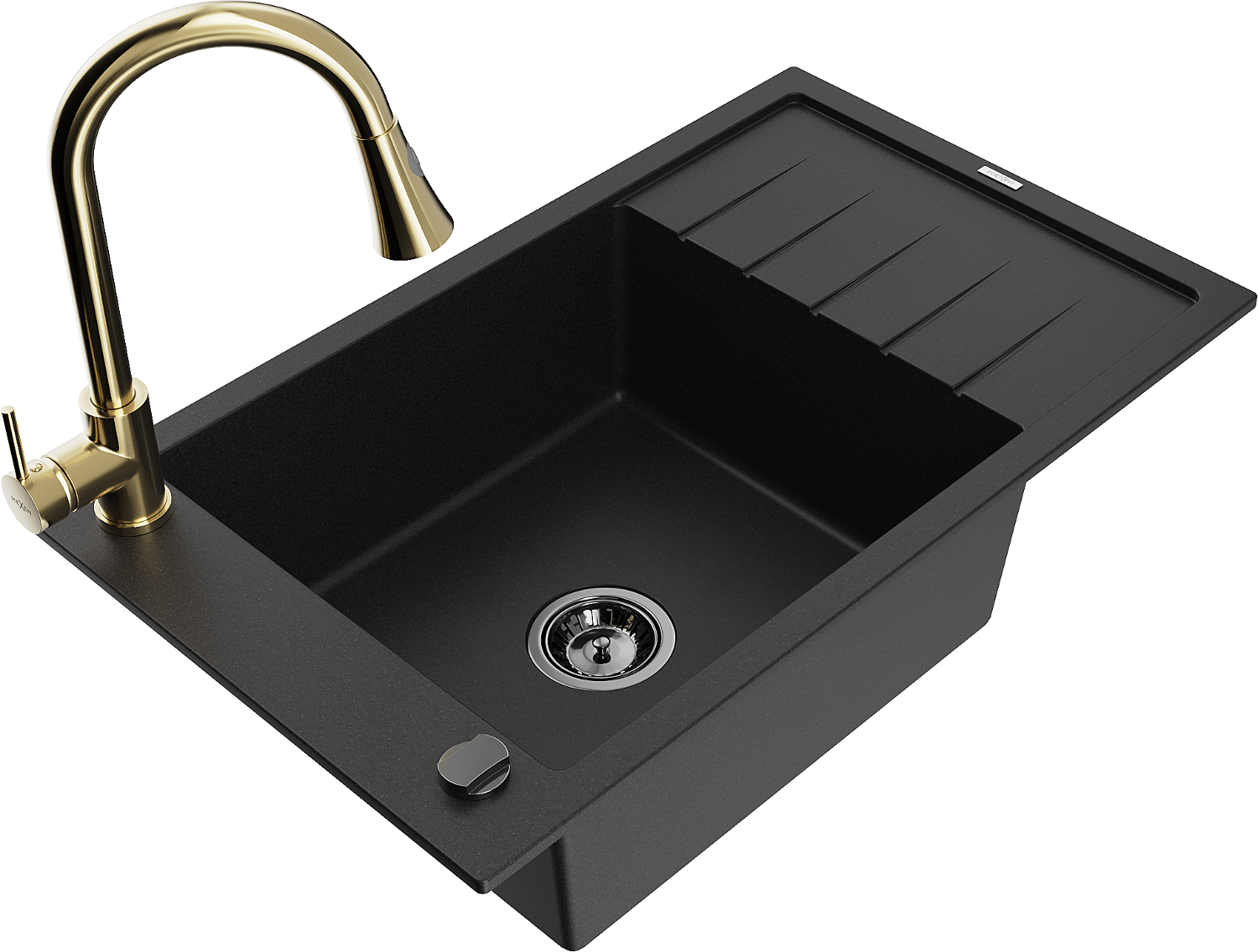 Mexen Elias zlewozmywak granitowy 1-komorowy z ociekaczem i baterią kuchenną Elia, czarny - 6511-77-670101-50-B