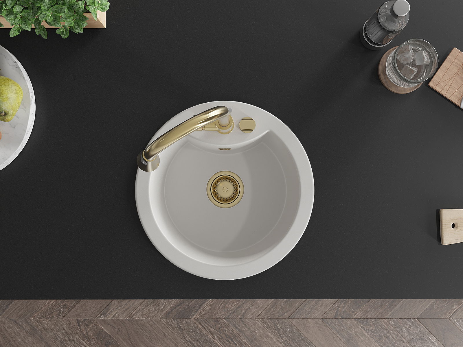 Zlew posiada podfrezowany otwór o średnicy 35 mm do samodzielnego wybicia. Można go wykorzystać m.in. do montażu dozownika na płyn, który wyeliminuje obecność plastikowych butelek w kuchni i nada jej eleganckiego wykończenia.