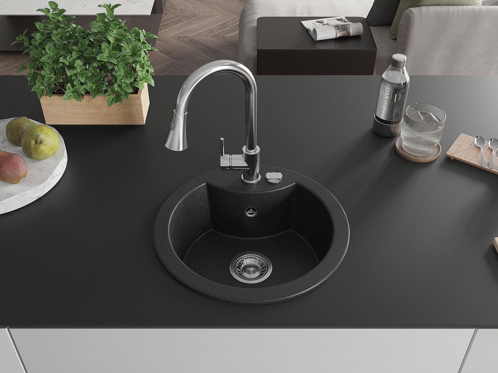 Mexen Diego zlewozmywak granitowy 1-komorowy z baterią kuchenną Elia, czarny/srebrny metalik - 6512-73-670101-00