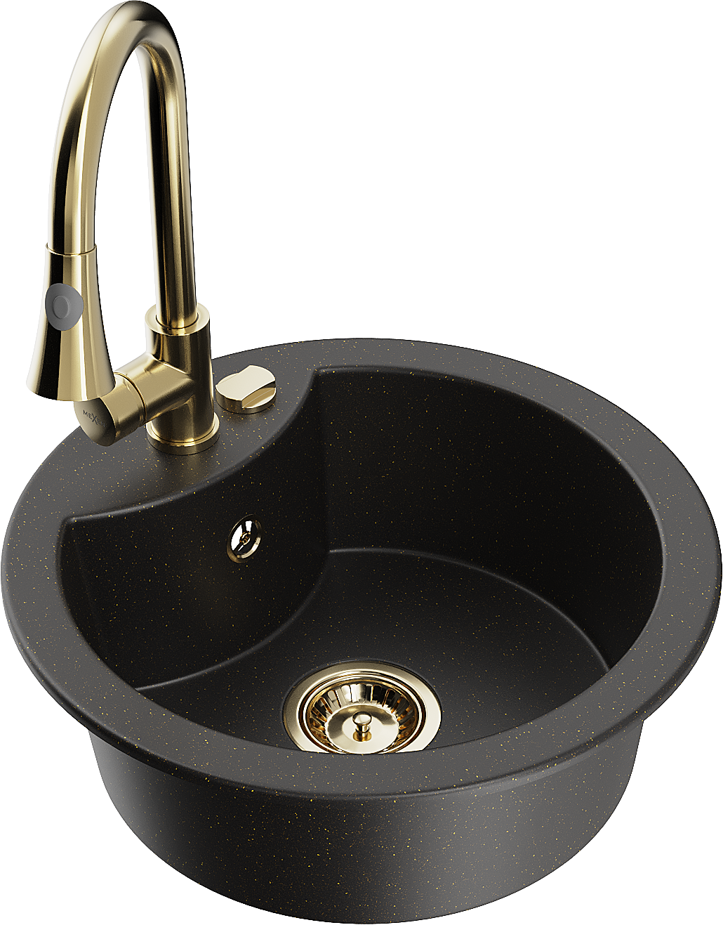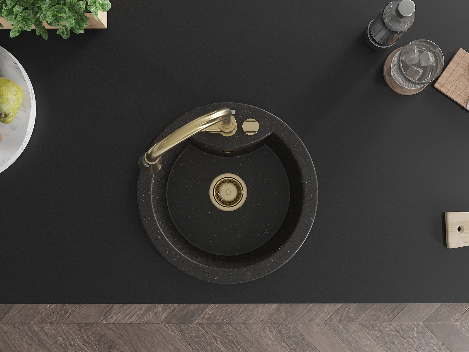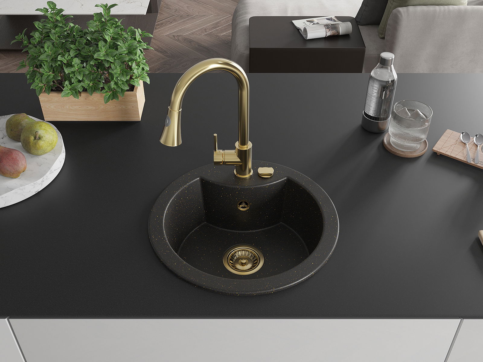 Mexen Diego zlewozmywak granitowy 1-komorowy z baterią kuchenną Elia, czarny/złoty metalik - 6512-75-670101-50