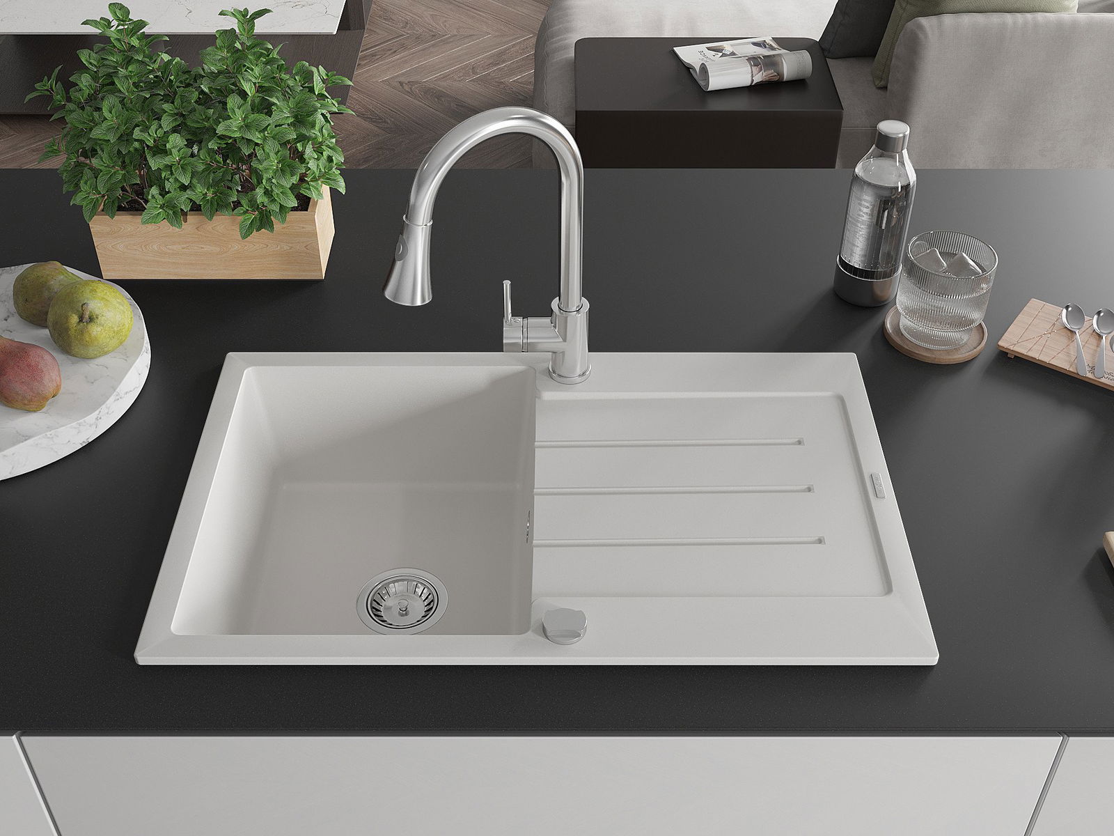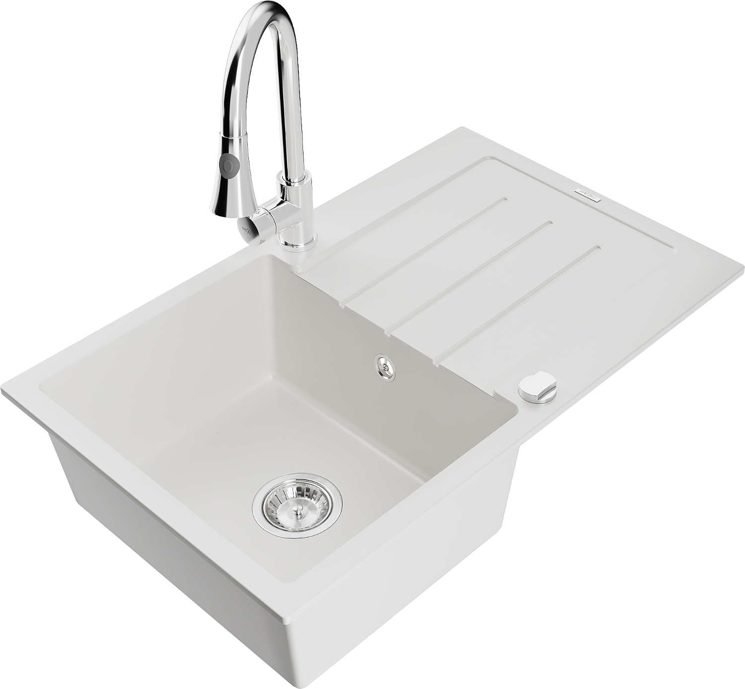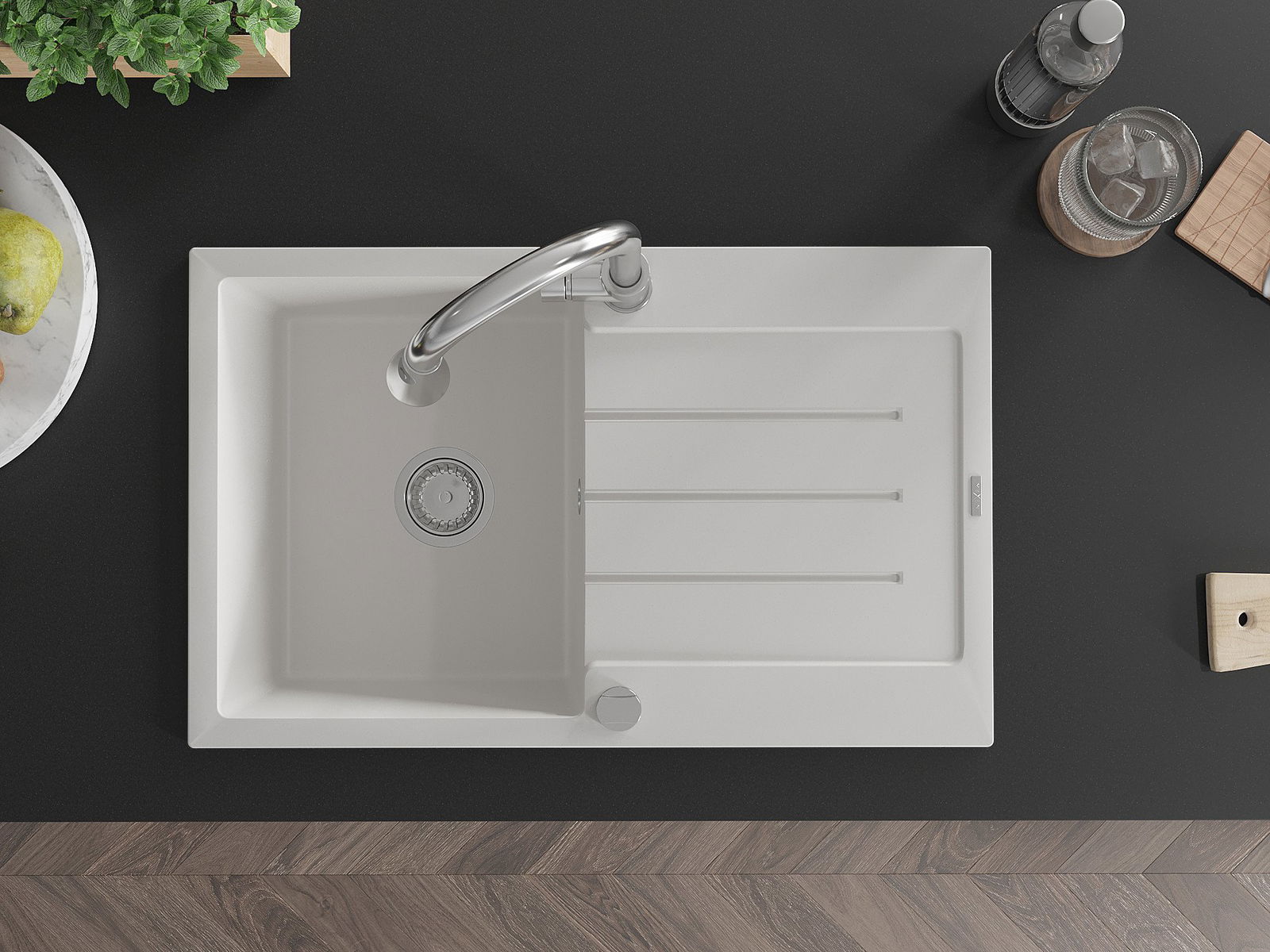 Mexen Bruno zlewozmywak granitowy 1-komorowy z ociekaczem i baterią kuchenną Elia, biały - 6513-20-670101-00
