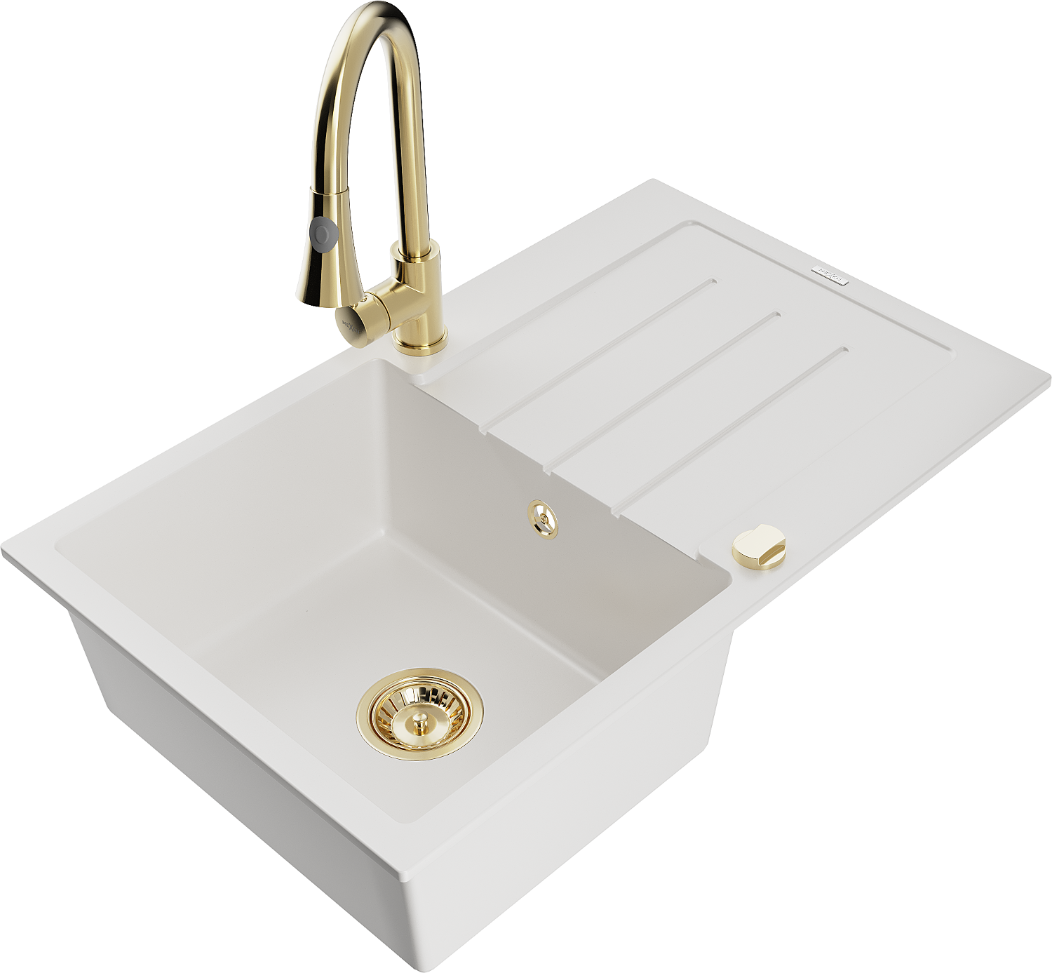 Mexen Bruno zlewozmywak granitowy 1-komorowy z ociekaczem i baterią kuchenną Elia, biały - 6513-20-670101-50