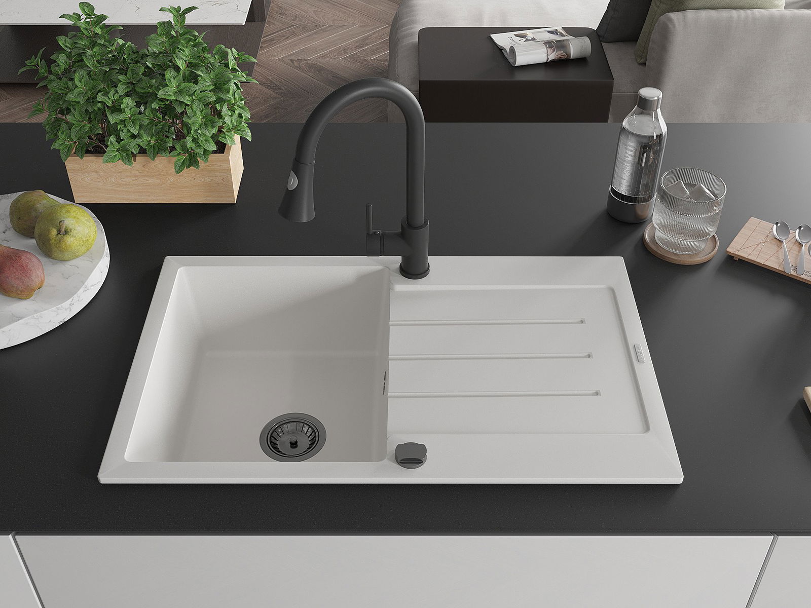 Mexen Bruno zlewozmywak granitowy 1-komorowy z ociekaczem i baterią kuchenną Elia, biały - 6513-20-670101-70