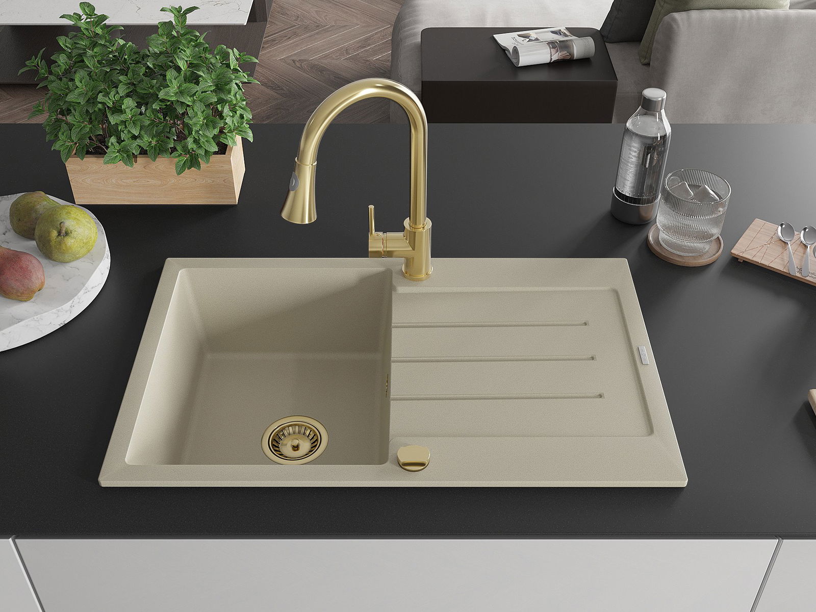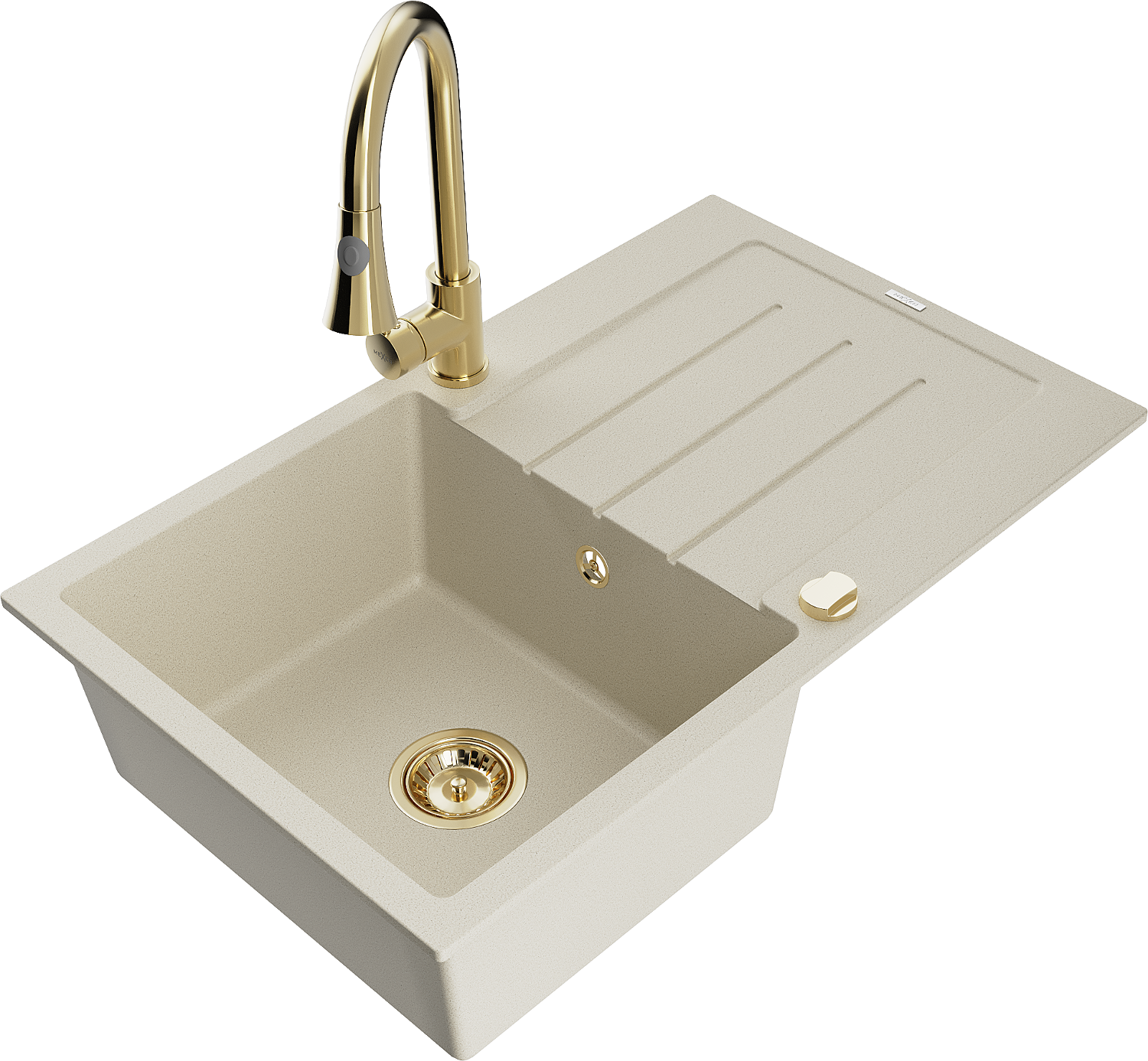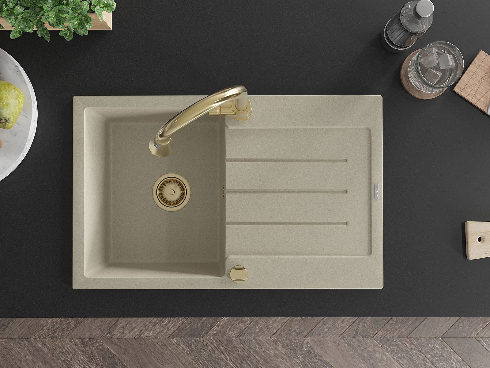 Mexen Bruno zlewozmywak granitowy 1-komorowy z ociekaczem i baterią kuchenną Elia, beżowy - 6513-69-670101-50