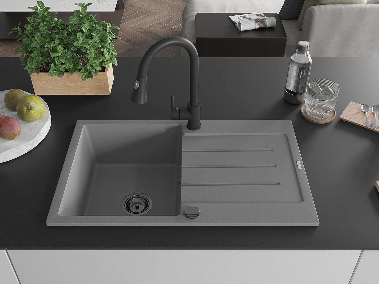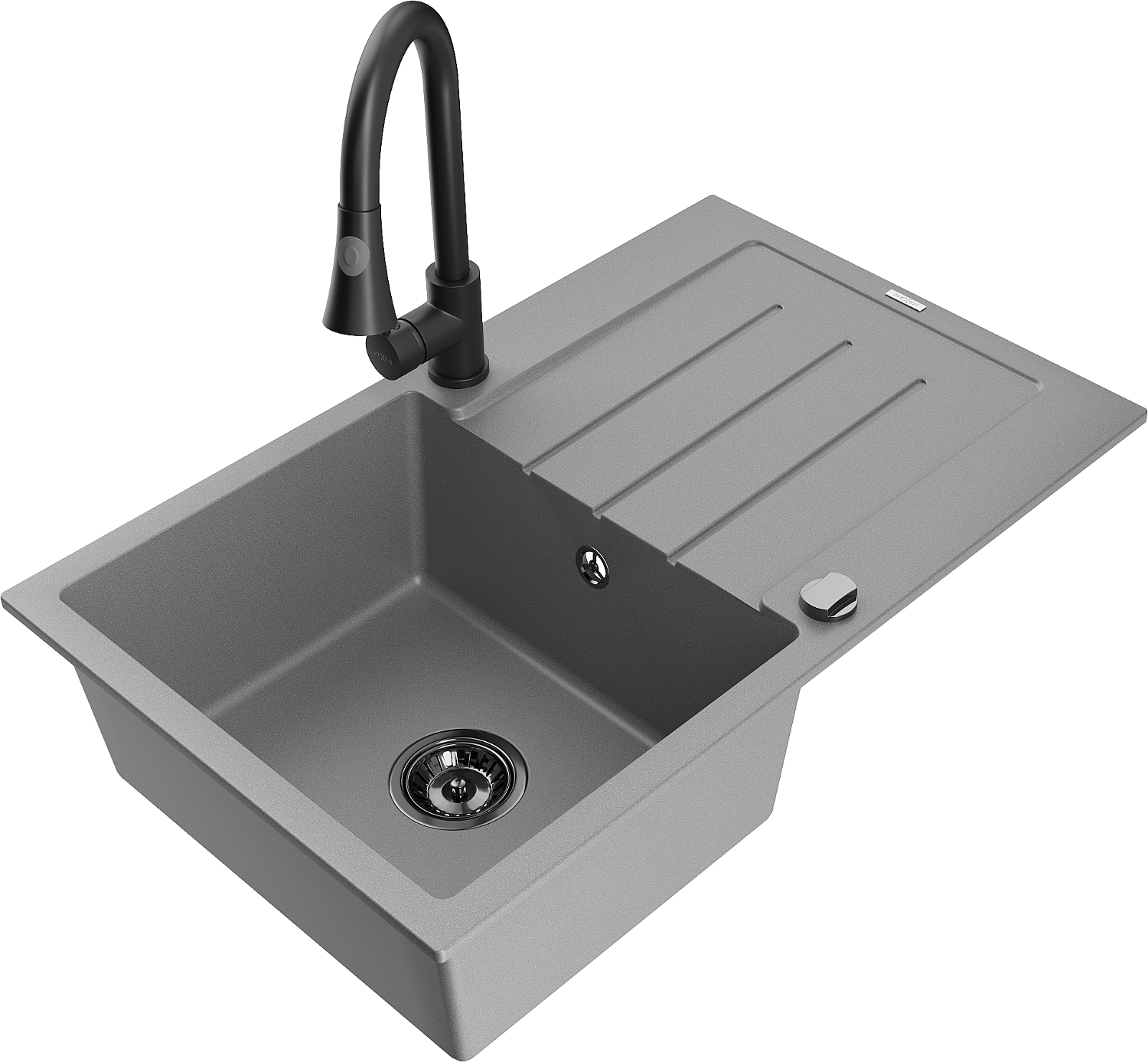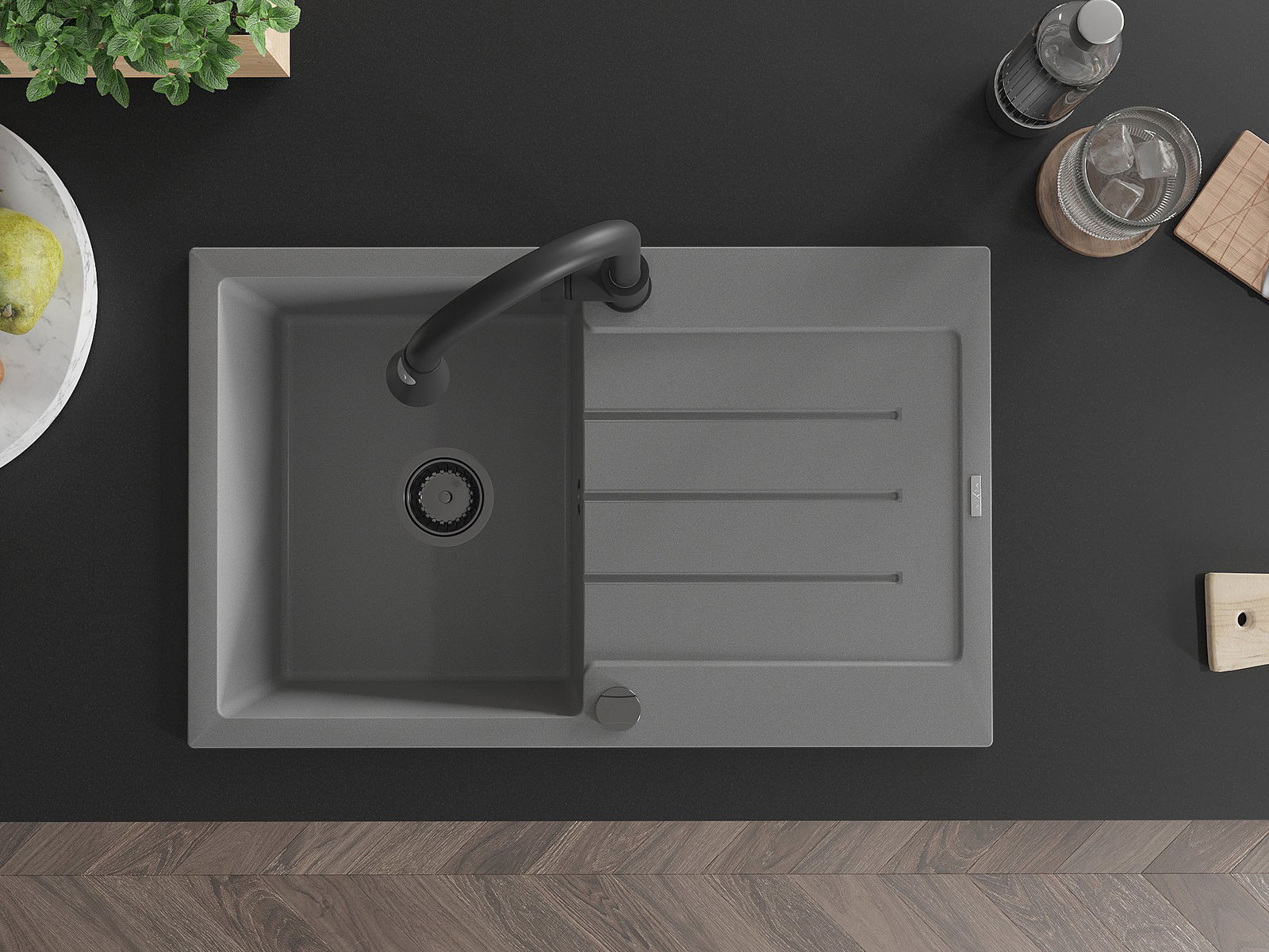 Mexen Bruno zlewozmywak granitowy 1-komorowy z ociekaczem i baterią kuchenną Elia, szary - 6513-71-670101-70-B