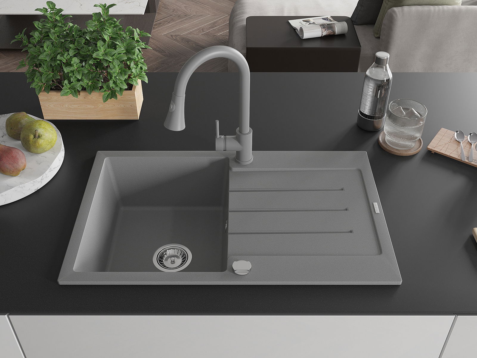 Mexen Bruno zlewozmywak granitowy 1-komorowy z ociekaczem i baterią kuchenną Elia, szary - 6513-71-670101-71
