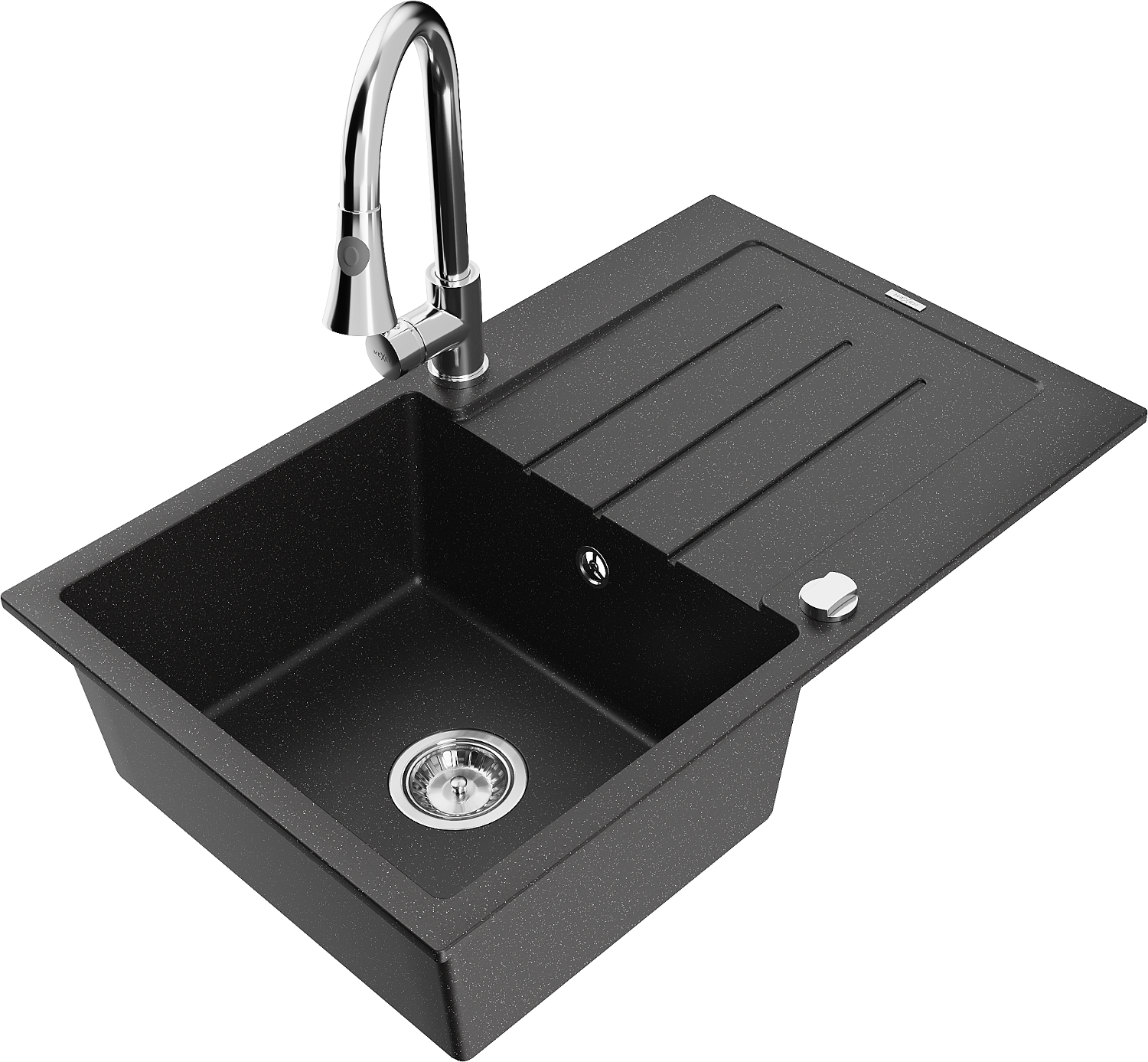 Mexen Bruno zlewozmywak granitowy 1-komorowy z ociekaczem i baterią kuchenną Elia, czarny/srebrny metalik - 6513-73-670101-00