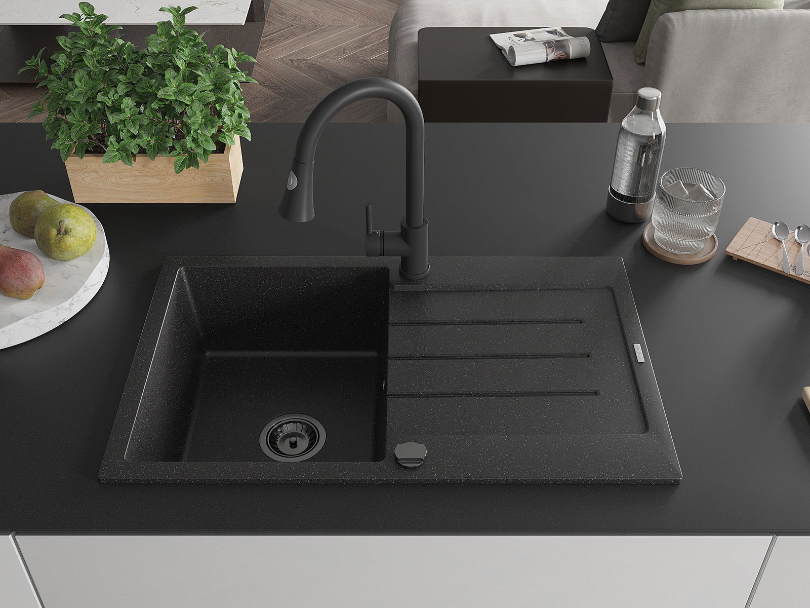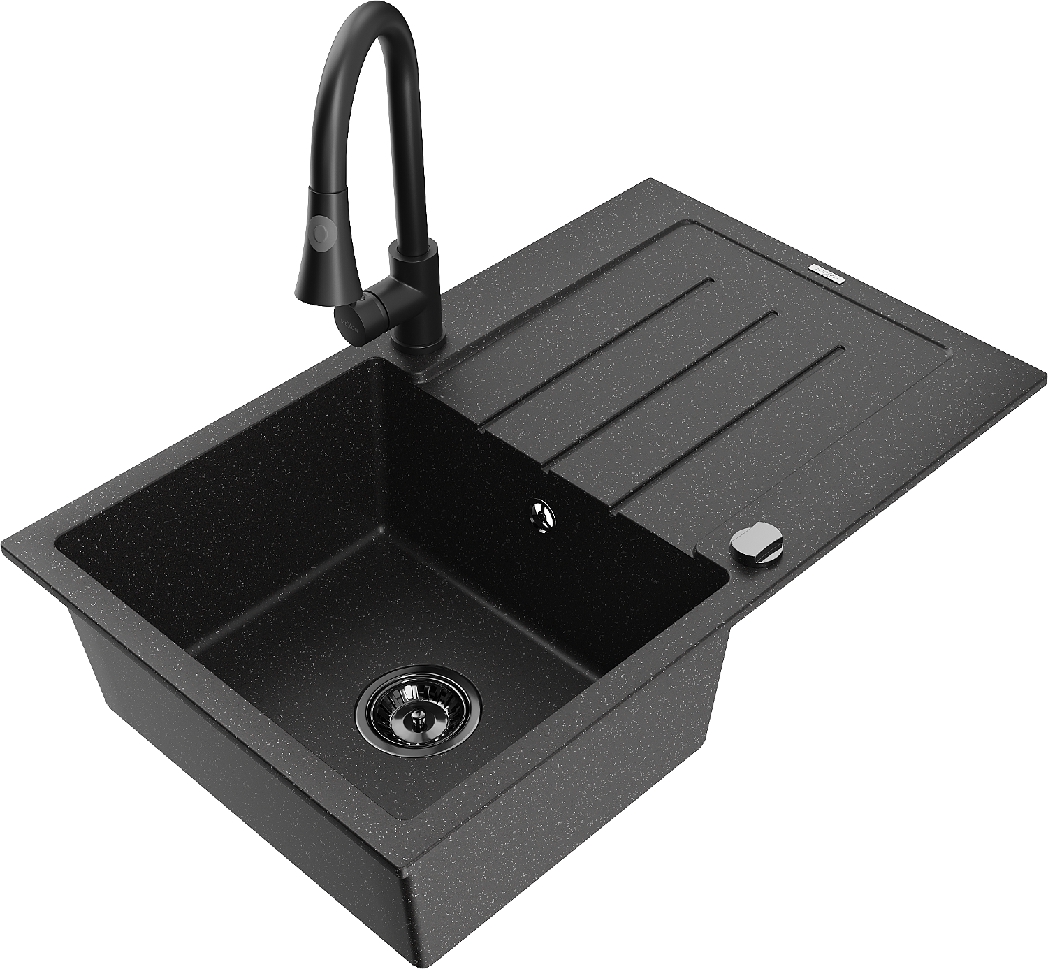 Mexen Bruno zlewozmywak granitowy 1-komorowy z ociekaczem i baterią kuchenną Elia, czarny/srebrny metalik - 6513-73-670101-70-B