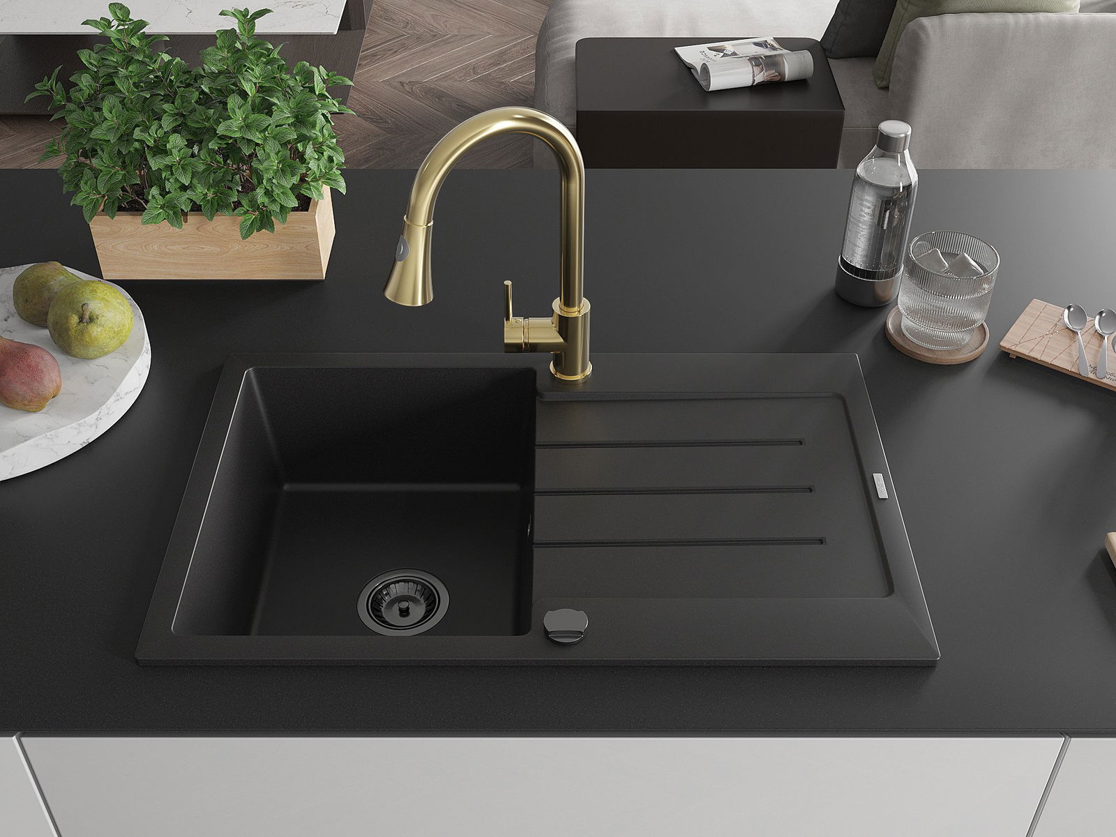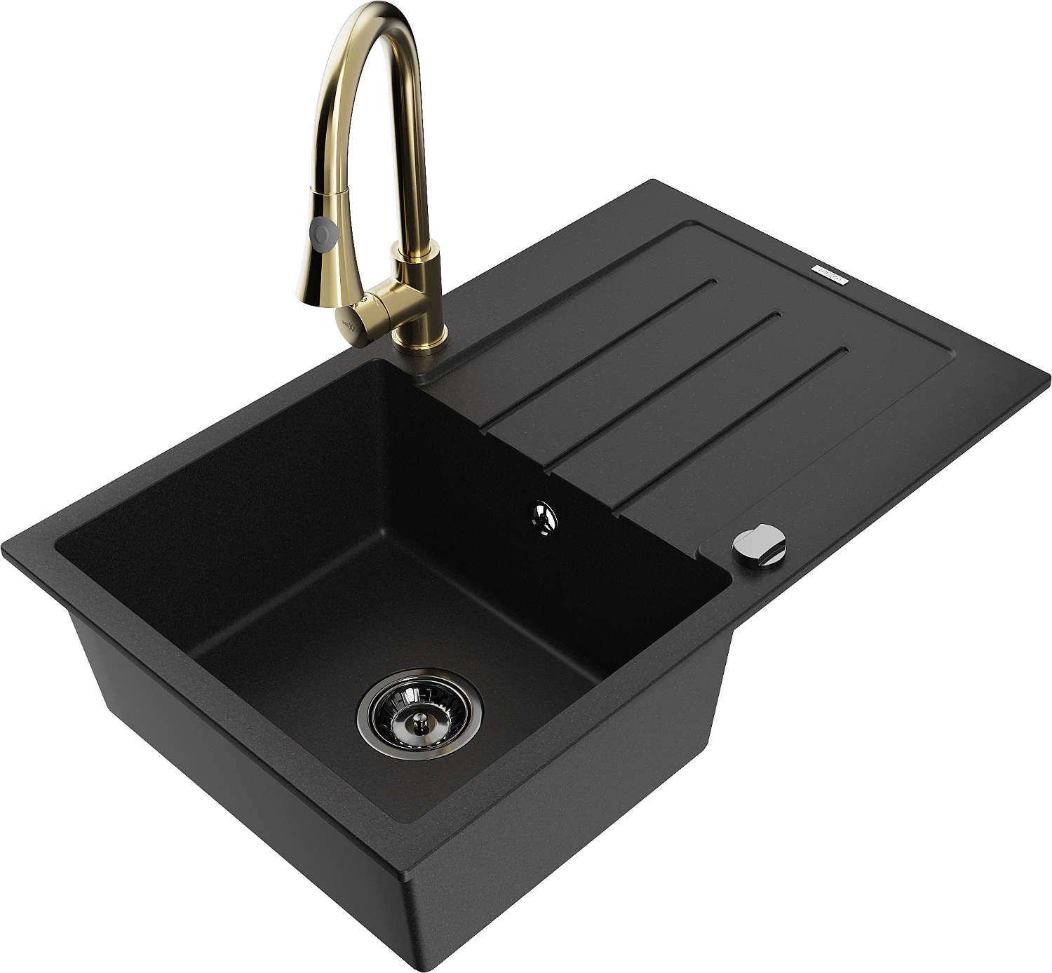 Mexen Bruno zlewozmywak granitowy 1-komorowy z ociekaczem i baterią kuchenną Elia, czarny - 6513-77-670101-50-B