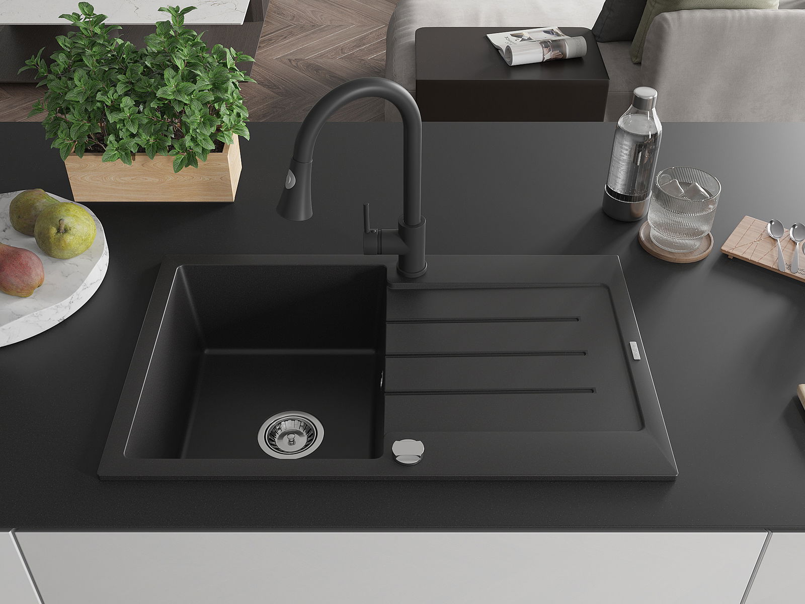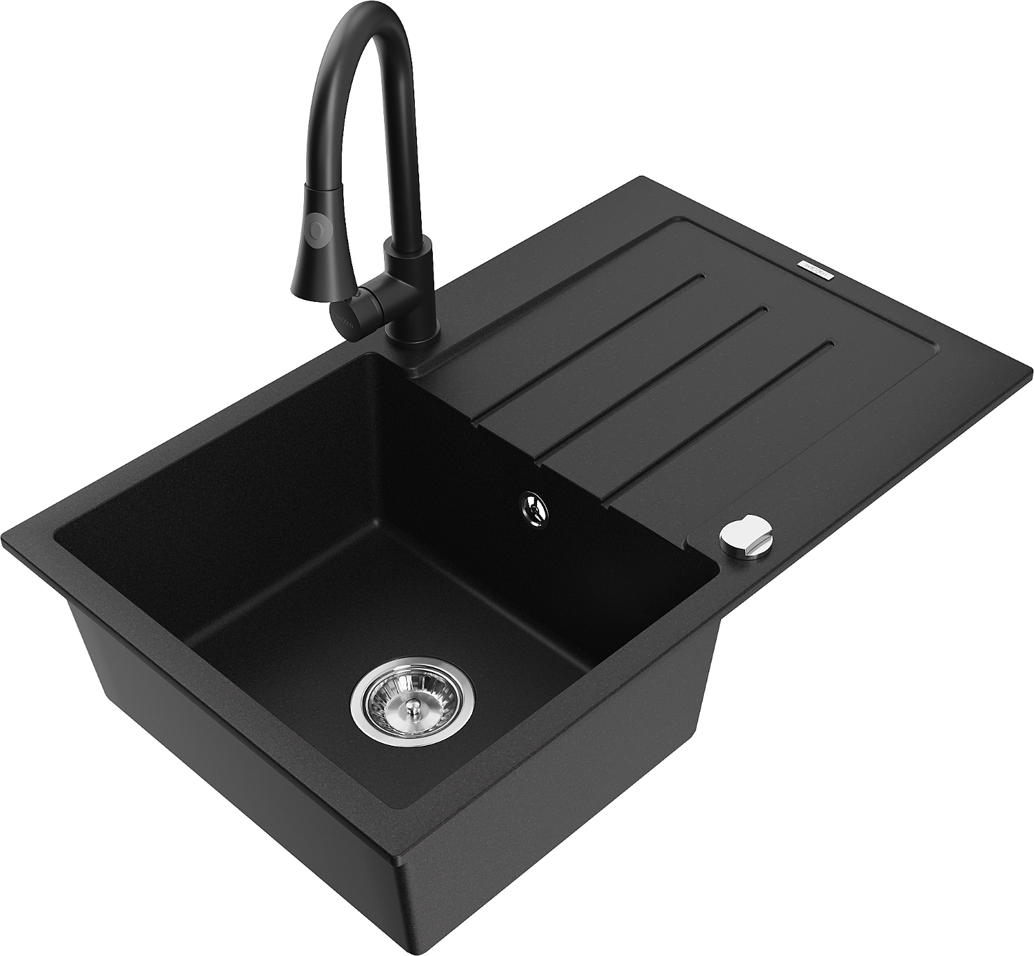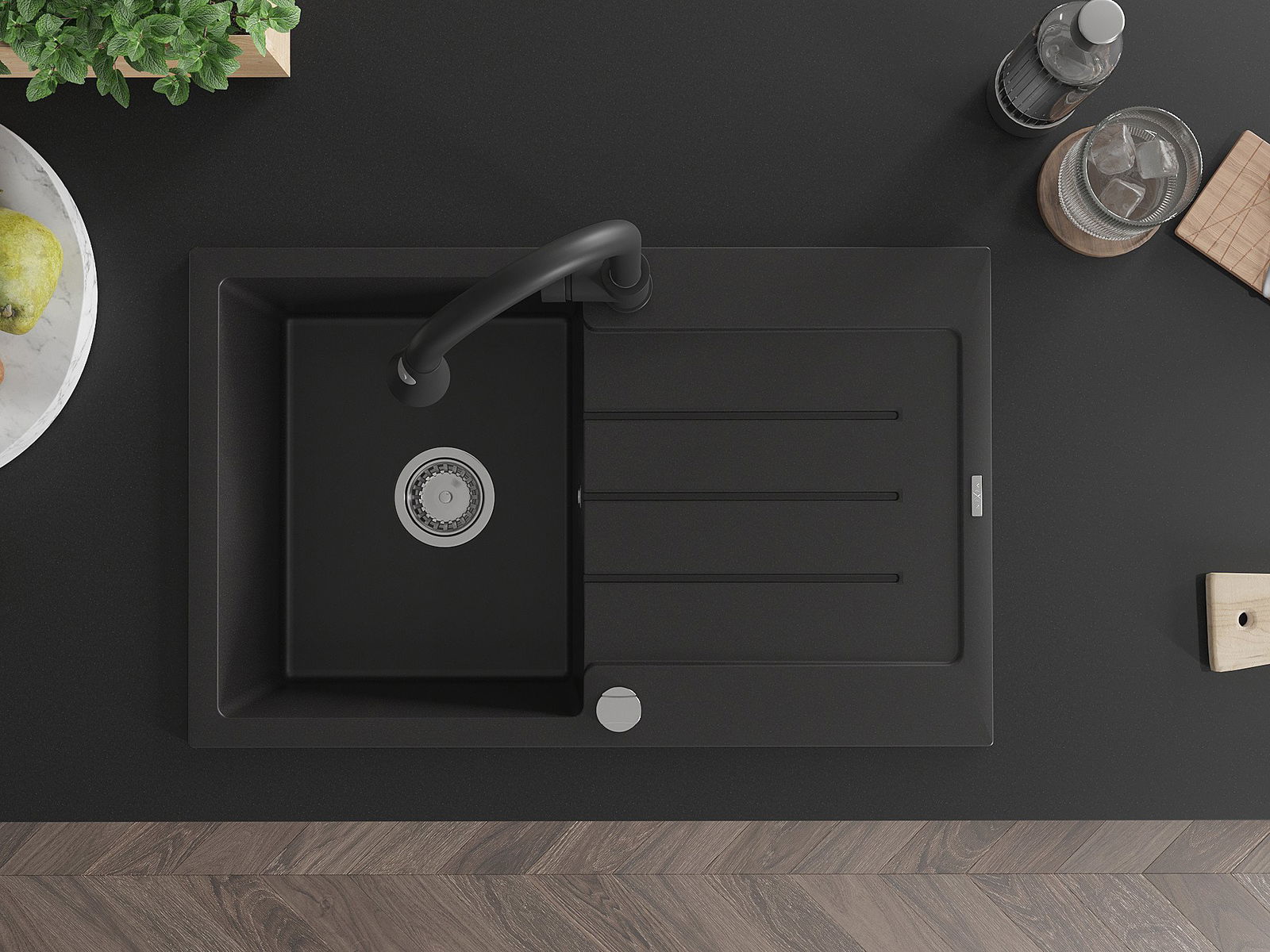 Mexen Bruno zlewozmywak granitowy 1-komorowy z ociekaczem i baterią kuchenną Elia, czarny - 6513-77-670101-70