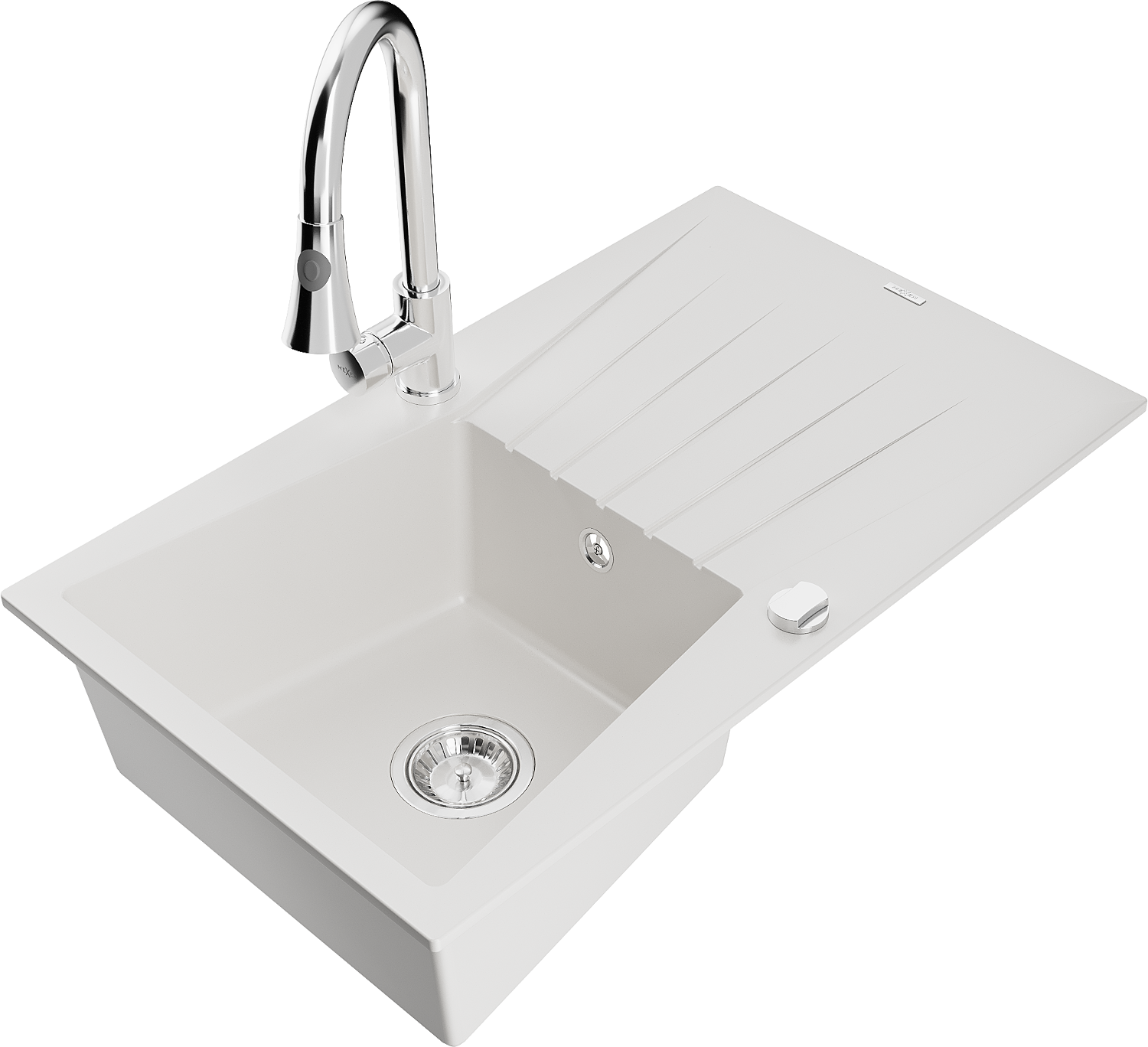 Mexen Cesar zlewozmywak granitowy 1-komorowy z ociekaczem i baterią kuchenną Elia, biały - 6514-20-670101-00