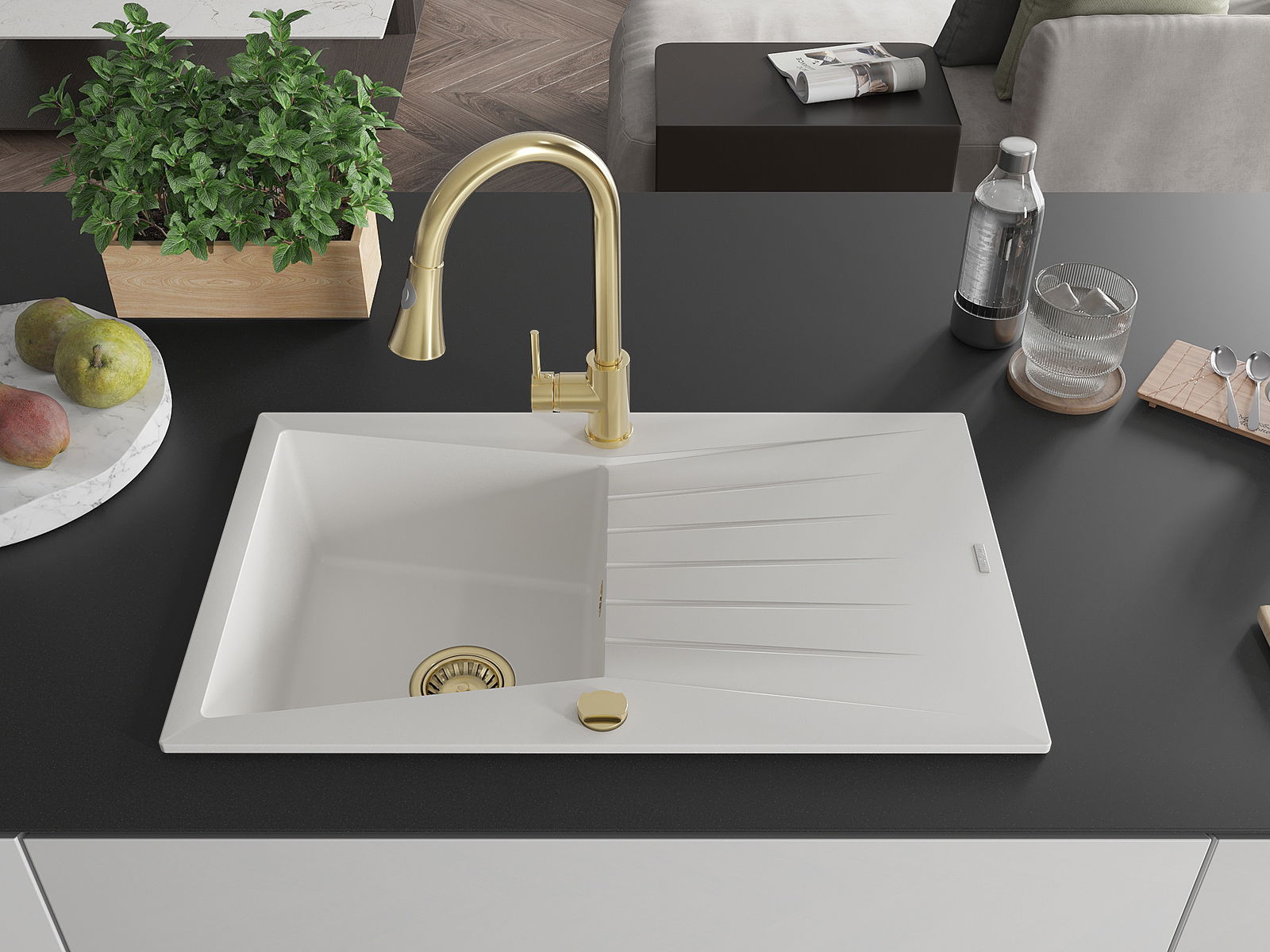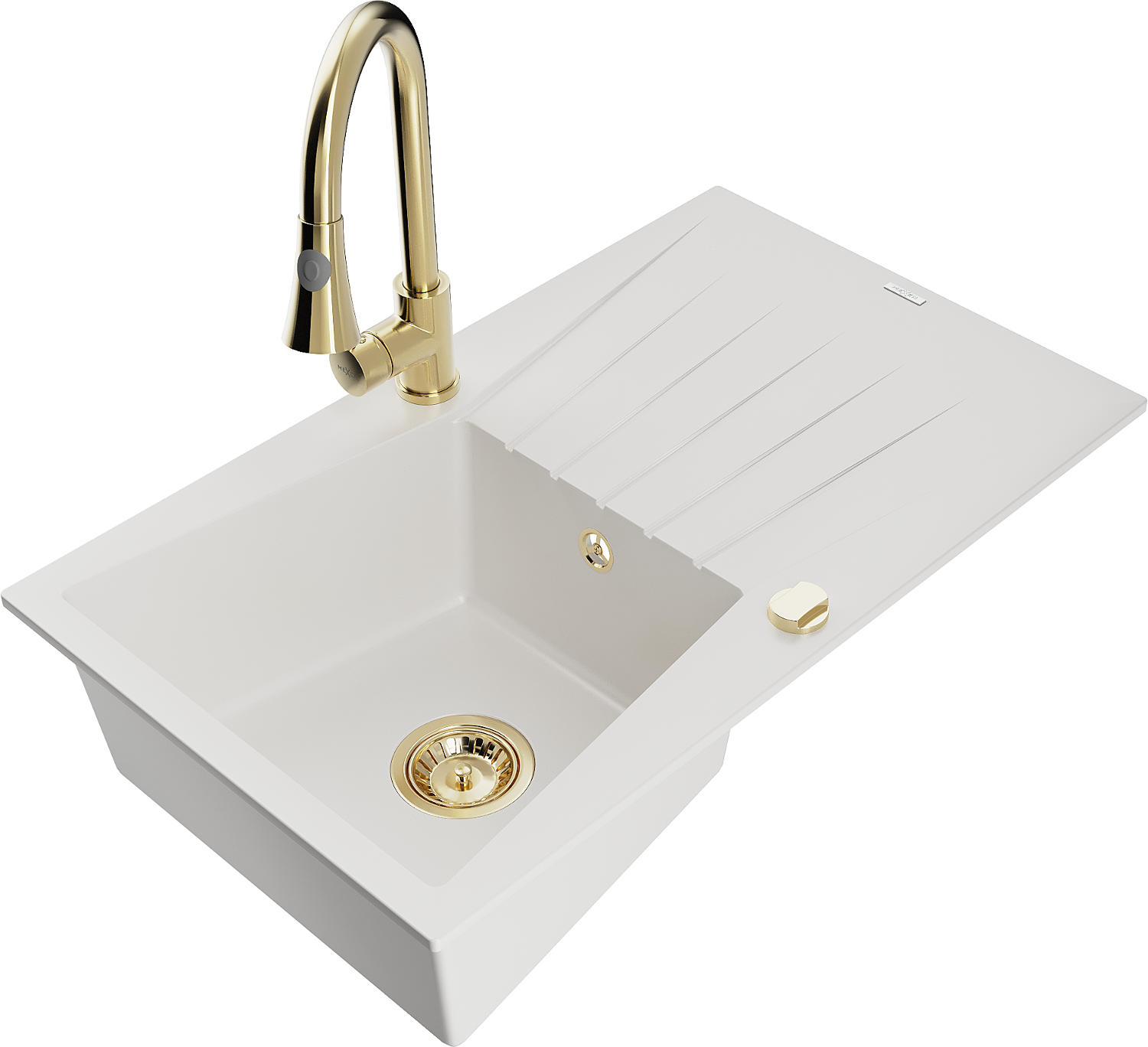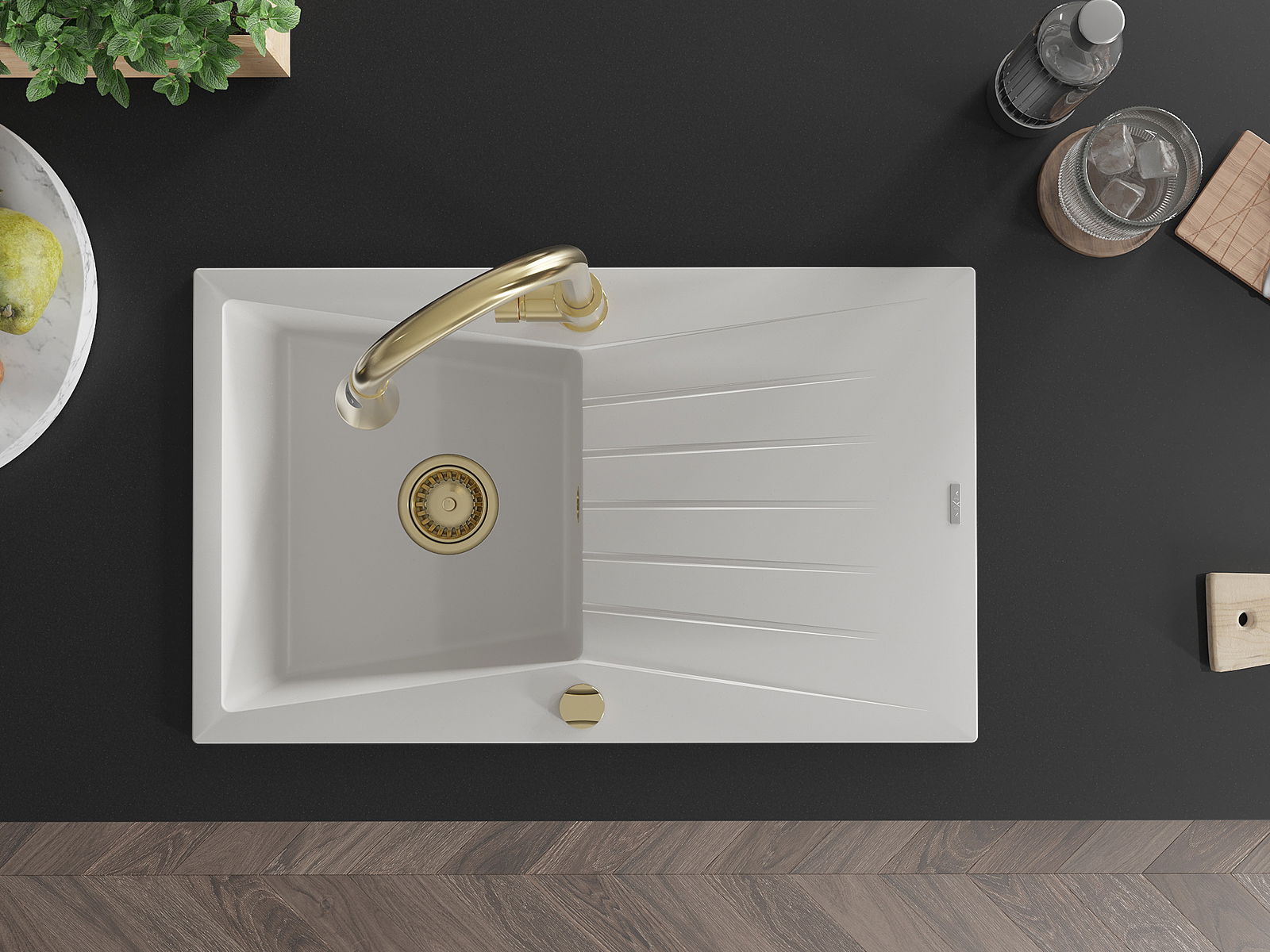Mexen Cesar zlewozmywak granitowy 1-komorowy z ociekaczem i baterią kuchenną Elia, biały - 6514-20-670101-50