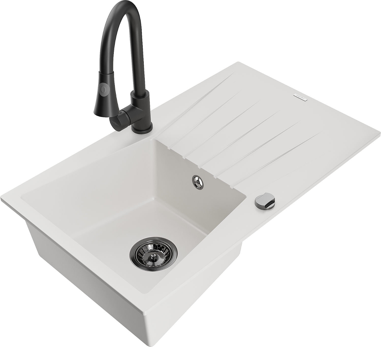 Mexen Cesar zlewozmywak granitowy 1-komorowy z ociekaczem i baterią kuchenną Elia, biały - 6514-20-670101-70